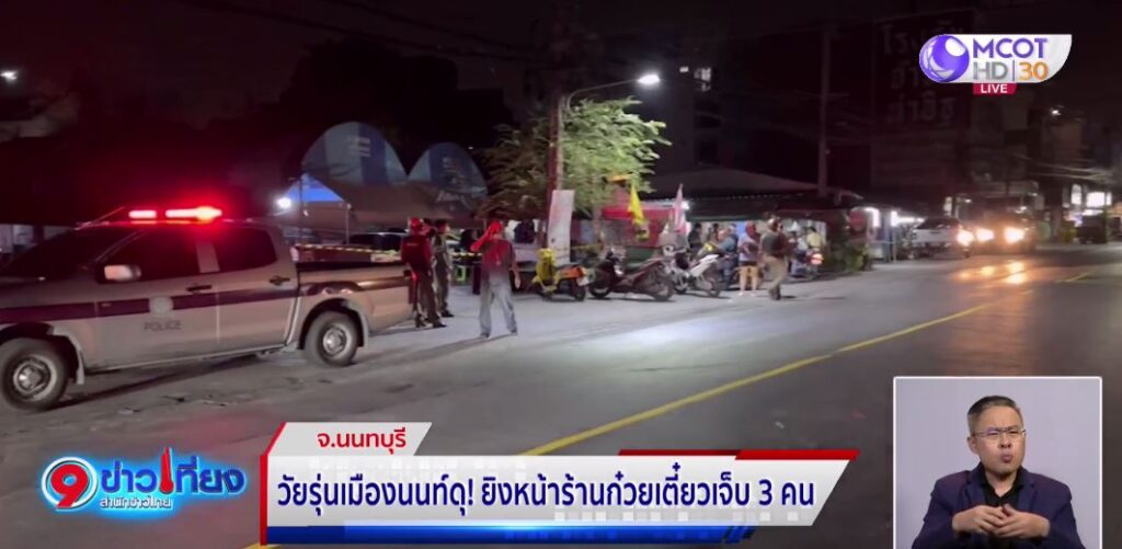 นนทบุรี 24 พ.ค. – วัยรุ่นเมืองนนทบุรี ดวลปืนสนั่นหน้าร้านก๋วยเตี๋ยวบาดเจ็บ 3 คน ตำรวจเร่งตามตัวมาดำเนินคดี ชาวบ้านผวาไม่อยากให้เกิดเหตุการณ์แบบนี้อีก