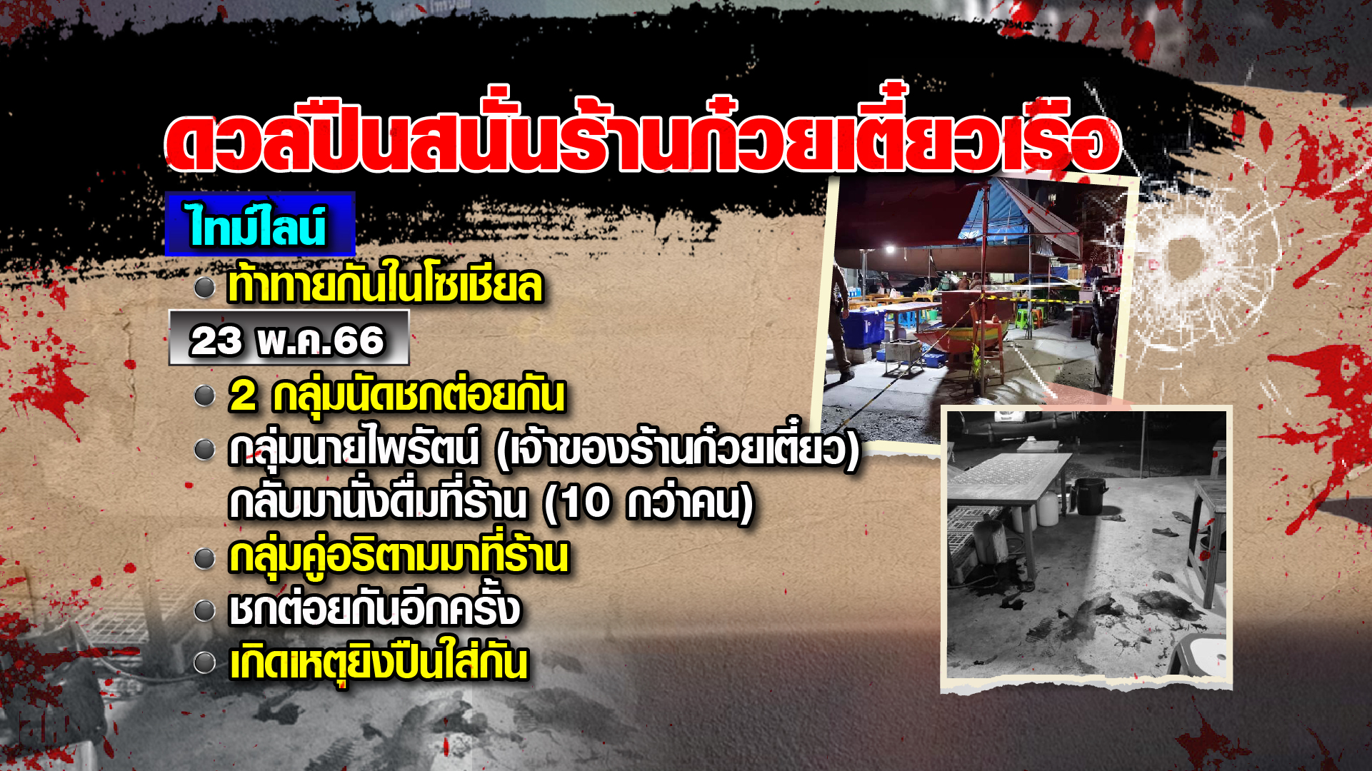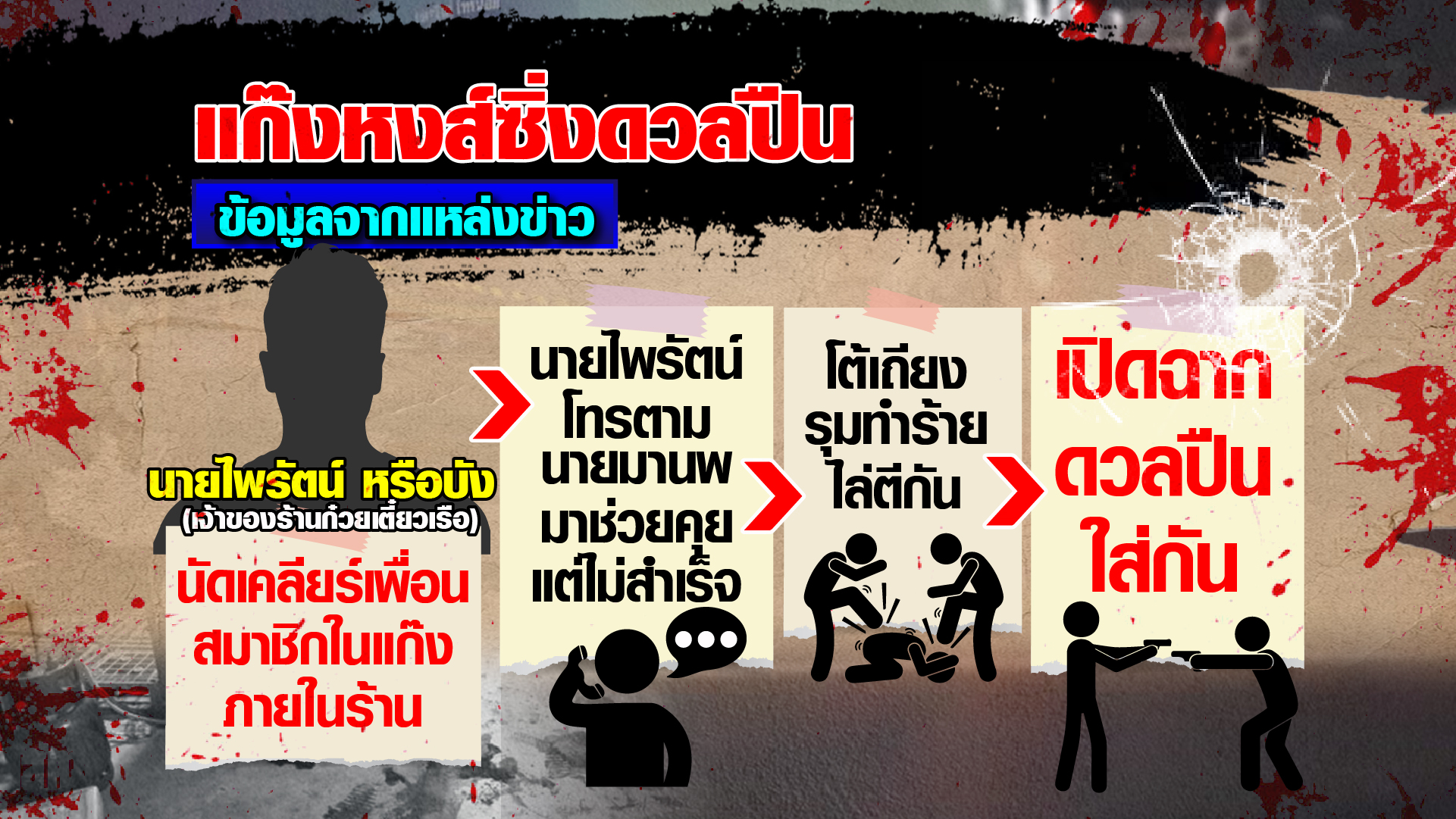 มีข้อมูลจากแหล่งข่าว บอกว่า นายไพรัตน์ เจ้าของร้านก๋วยเตี๋ยวที่เกิดเหตุ เป็นหนึ่งในสมาชิก “แก๊งหงส์ซิ่ง” ได้นัดเคลียร์ปัญหากับเพื่อนสมาชิกในแก๊ง โดยมีการนั่งดื่มกินกันตั้งแต่ช่วงเย็น แต่ไม่สามารถเคลียร์ปัญหากันได้ นายไพรัตน์ จึงโทรตามเพื่อนสนิท คือ นายมานพ ให้มาช่วยเจรจากับเพื่อนๆ สมาชิกในแก๊ง แต่ก็ไม่สามารถตกลงกันได้ จึงเกิดการโต้เถียงและรุมทำร้ายไล่ตีกัน ก่อนจะเปิดฉากดวลปืนใส่กัน