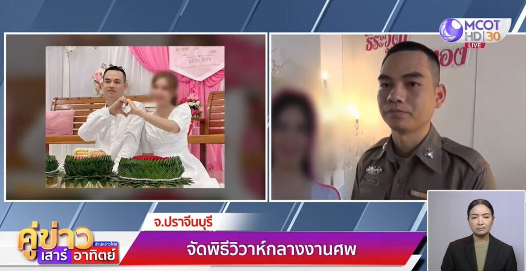 ปราจีนบุรี 28 พ.ค. – สุขเคล้าน้ำตา ตำรวจหนุ่มจัดพิธีวิวาห์กลางงานศพ สานฝันแฟนสาวที่เสียชีวิตกะทันหัน ท่ามกลางญาติและเพื่อนร่วมงานจำนวนมาก