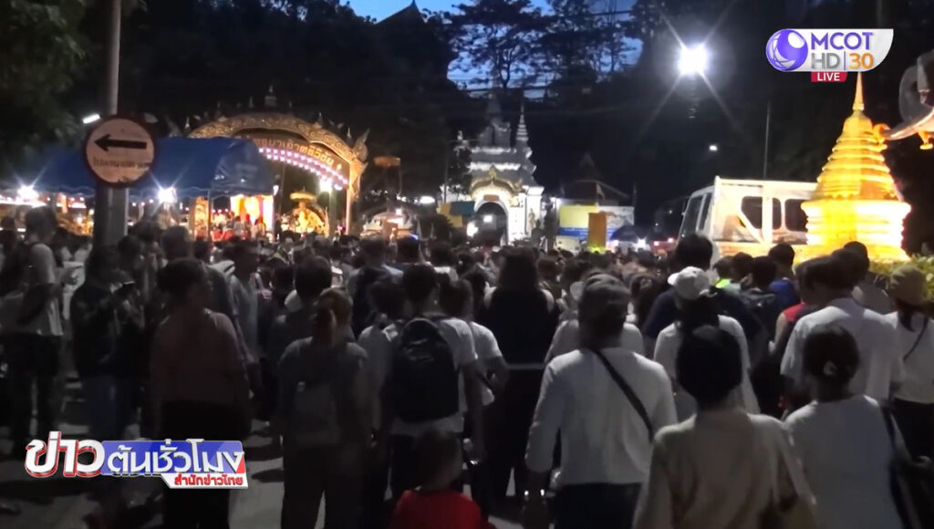 ขณะที่นักท่องเที่ยว และชาวเชียงใหม่นับหมื่นคน เดินเท้าขึ้นดอยสุเทพระยะทาง 11 กิโลเมตร เพื่อร่วมสรงน้ำพระธาตุดอยสุเทพ ในวันวิสาขบูชา เพื่อความเป็นสิริมงคล สืบสานประเพณีเตียวขึ้นดอย พร้อมทั้งมีขบวนแห่น้ำสรงและผ้าไตร พระราชทานพระบาทสมเด็จพระเจ้าอยู่หัว เพื่อนำขึ้นไปสรงน้ำองค์พระธาตุ.-สำนักข่าวไทย