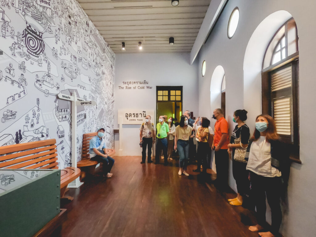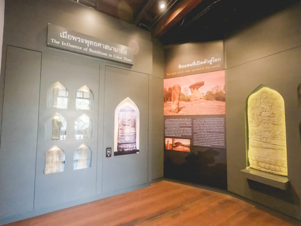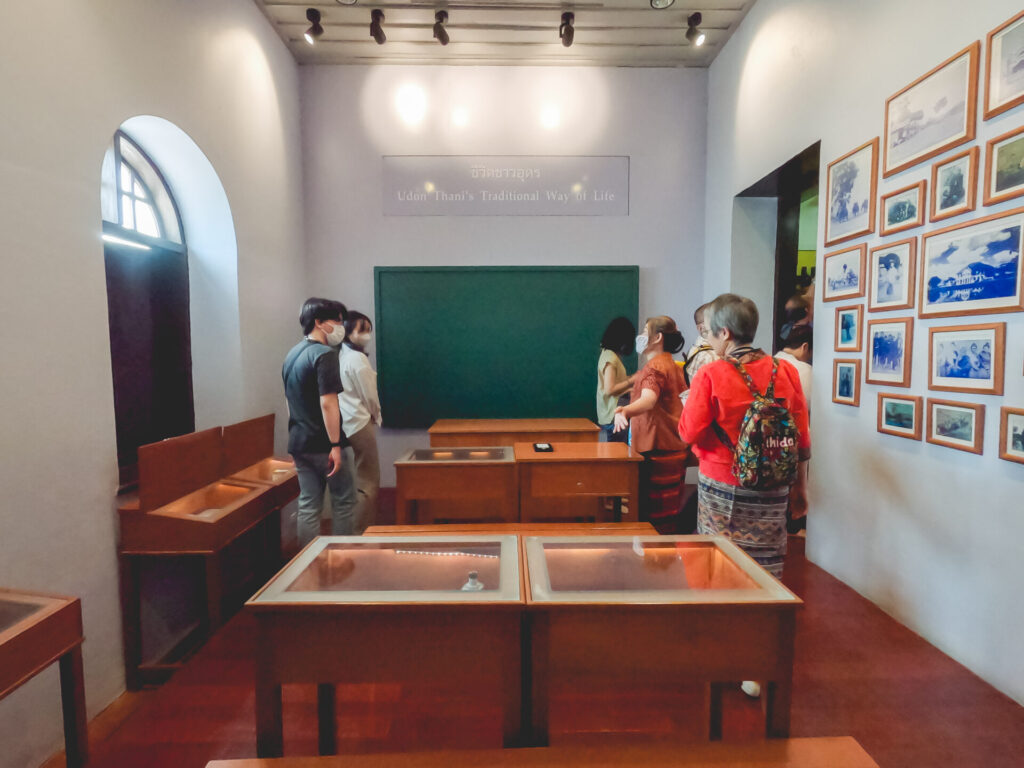 ภายในอาคารมีห้องจัดแสดงทั้งหมด 26 ห้อง แบ่งเป็นชั้นล่าง 11 ห้อง จัดแสดงเรื่องราวเกี่ยวกับจังหวัดอุดรธานี ทั้งประวัติศาสตร์ โบราณคดี ธรรมชาติวิทยา ธรณีวิทยา ประวัติศาสตร์ท้องถิ่น และศิลปวัฒนธรรม รวมถึงพระประวัติและพระเกียรติคุณของกรมหลวงประจักษ์ศิลปาคมผู้ก่อตั้งเมืองอุดรธานี อาทิ ห้องเมื่อพื้นดินอีสานอยู่ใต้ทะเล ห้องเกี่ยวกับบุคคลสำคัญที่สร้างคุณประโยชน์ให้กับเมืองอุดรธานี ห้องของดีเมืองอุดรธานี ชั้นบน 15 ห้อง จัดแสดงเรื่องราววิถีชีวิตของชาวอุดรธานีในด้านต่าง ๆ เช่น จำลองห้องเรียน จำลองสถานีรถไฟในสมัยในยุคสมัยเหตุการณ์ รศ.112 ร้านกาแฟ ร้านถ่ายภาพ และตัดผมโบราณ