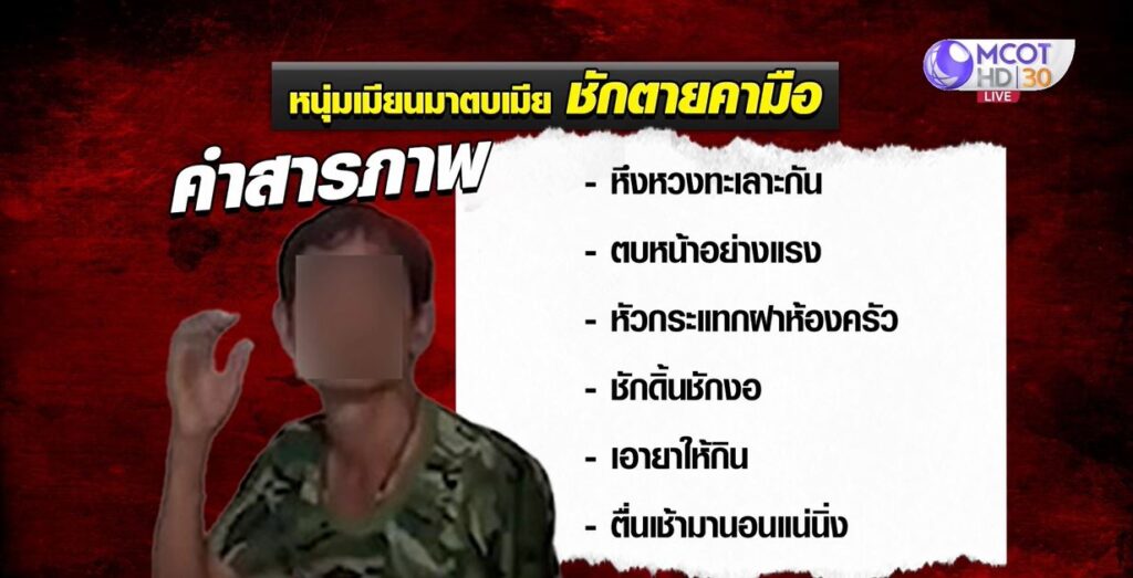 ผู้ก่อเหตุเล่าว่า ตัวเองอายุ 49 ปี ภรรยาอายุ 34 ปี มีอาชีพรับจ้างทำงานก่อสร้างด้วยกันทั้งคู่ และมีลูกสาวด้วยกัน 1 คน อายุ 1 ขวบ แรกๆ ก็รักกันดี แต่พักหลังตัวเองหึงหวงภรรยา ทำให้ทะเลาะกันบ่อย ถึงขั้นลงไม้ลงมือ เมื่อคืนยิ่งทะเลาะกันหนัก เผลอตบภรรยาไปอย่างแรงจนศีรษะ ไปกระแทกกับกำแพงห้องครัว นาทีนั้นภรรยาล้มลงชักดิ้นชักงอ ตัวเองพยายามช่วย ด้วยการหายามาให้กิน แล้วภรรยาก็นิ่งไป กระทั่งเมื่อเช้าภรรยาก็ยังนอนนิ่งอยู่บนฟูก ตัวเองมาเขย่าตัวปลุก พบว่าเสียชีวิตแล้ว