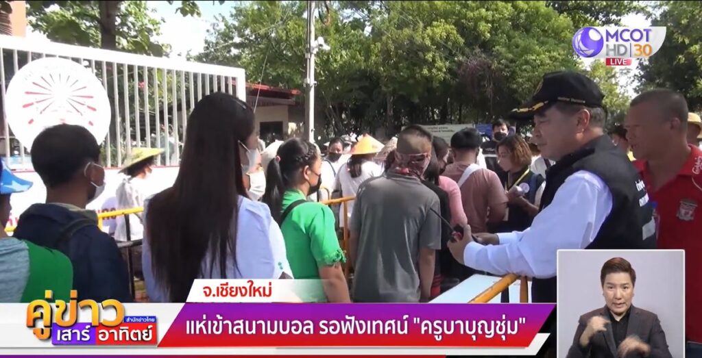 พี่น้องไตและชาวเชียงใหม่ นับหมื่นคน ที่เสื่อมใสเคารพศรัทธา พระครูบาบุญชุ่ม ญาณสํวโร พระเกจิชื่อดังที่จะเดินทางมาแสดงธรรม ในเวลา 18.00 น. ของวันนี้ ต่างพากันเดินทางมาตั้งแต่เช้า โดยเจ้าหน้าที่เปิดประตูให้เข้าในสนามกีฬาเทศบาลนครเชียงใหม่ เวลา 09.00 น. พร้อมทั้งแจกยันต์มหารวยพันล้านของพระครูบาบุญชุ่มให้กับทุกคน จากนั้นประชาชนได้นำเสื่อมาปูรอบๆ สนามฟุตบอล รอเวลาเพื่อเข้าไปในสนามหญ้าหน้าหอธรรม จุดที่แสดงธรรมให้มากที่สุด ส่วนบริเวณในหอธรรมห้ามผู้หญิงเข้า