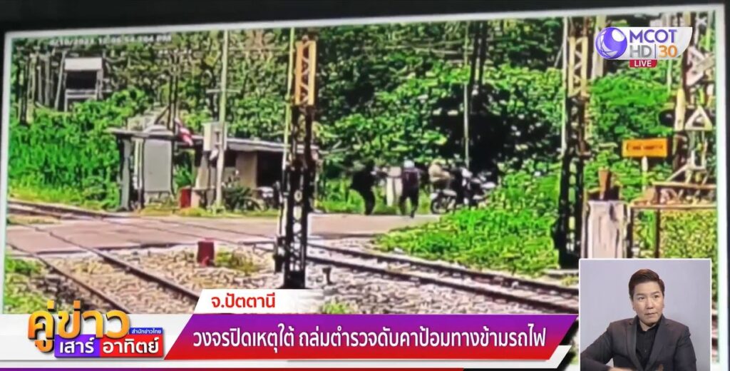 ปัตตานี 11 มิ.ย. – ตำรวจปัตตานี เผยกล้องวงจรปิด คนร้ายแต่งกายคล้ายผู้หญิงใช้อาวุธสงครามยิงถล่มตำรวจดับ 1 นาย คาป้อมทางข้ามรถไฟ ก่อนขโมยปืนเอ็ม 16 เร่งติดตามตัว