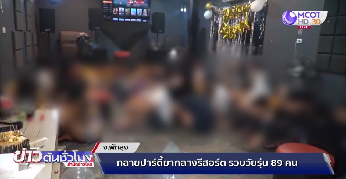 พล.ต.ต.ตานิตย์ รามดิษฐ์ ผบก.ภ.จว.พัทลุง เปิดเผยว่า ตำรวจภูธรภาค 9 และชุดสืบสวนตำรวจภูธรจังหวัดพัทลุง สนธิกำลังบุกทลายปาร์ตี้ยาเสพติดในรีสอร์ตแห่งหนึ่ง อ.ปากพะยูน จ.พัทลุง จับกุมผู้ต้องหาชาย-หญิง อายุ 18-35 ปี จำนวน 89 คน ซึ่งเข้าไปเที่ยวสถานบันเทิงแห่งหนึ่งในพื้นที่ อ.หาดใหญ่ จ.สงขลา หลังจากนั้นได้ชักชวนพรรคพวกผ่านทางไลน์และเฟซบุ๊ก เข้ามาจัดปาร์ตี้ยาเสพติดในรีสอร์ตดังกล่าว