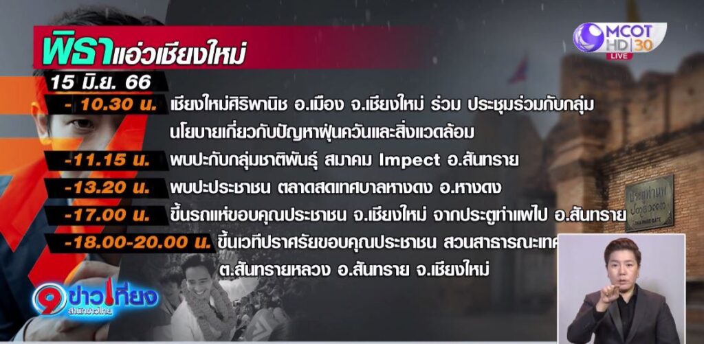 สำหรับกำหนดการลงพื้นที่เชียงใหม่วันนี้ เวลา 13.20 น. “พิธา” จะไปพบปะและขอบคุณประชาชนที่ตลาดสดเทศบาลหางดง อ.หางดง และในเวลา 17.00 น. จะขึ้นรถแห่ขอบคุณประชาชนที่ไว้วางใจ จากประตูท่าแพ แลนด์มาร์กจังหวัดเชียงใหม่ ไปอำเภอสันทราย