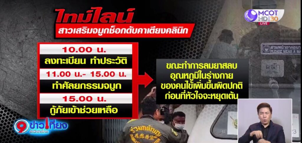 เหตุการณ์ดังกล่าว เมื่อวานนี้ ตำรวจ สภ.ประตูน้ำจุฬาลงกรณ์ รับแจ้งมีเหตุมีผู้เสียภายในคลินิกเสริมความงามแห่งหนึ่ง หน้าหมู่บ้านรัตนโกสินทร์ 200 ปี ที่เกิดเหตุมีประชาชนอยู่เป็นจำนวนมาก และพบผู้เสียชีวิตเป็นหญิง อายุ 25 ปี นอนเสียชีวิตอยู่ในห้องศัลยกรรมชั้นล่าง สอบถามแฟนของผู้เสียชีวิต บอกว่ามาส่งผู้ตายประมาณ 10 โมง ก่อนเข้าไปลงทะเบียนเพื่อทำประวัติ ตนเองจึงกลับไปรอแฟนสาวที่บ้าน เพราะทำจมูกใช้เวลานาน ตั้งแต่ 11.00-15.00 น. แต่ปรากฏว่าบ่าย 3 แล้ว แฟนยังไม่ทักมาให้ไปรับ ด้วยความเป็นห่วงจึงขับรถมาหา เห็นกู้ภัยกำนำเครื่องช่วยหายใจเข้าไปข้างใน สอบถามทราบว่าแฟนสาวอุณหภูมิร่างกายเพิ่มขึ้นปกติ ขณะดมยาสลบเพื่อทำศัลยกรรม ก่อนที่หัวใจจะหยุดเต้น