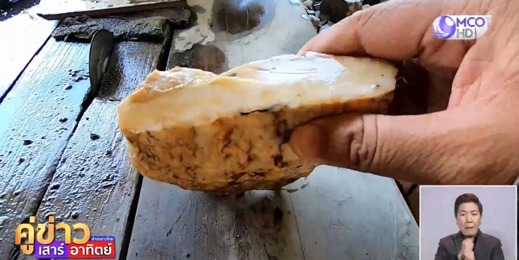 ผู้สื่อข่าวลงพื้นที่ไปพบกับนายศรีสุข ขัตติยะ และนางเหลี่ยม ขัตติยะ สามีและภรรยา ชาวบ้านนาบ้านไร่ ต.แม่ถอด อ.เถิน จ.ลำปาง ซึ่งกำลังผ่าหินที่ได้มา จะเห็นว่าด้านในของหินมีสีผสมผสานระหว่างสีเหลืองและสีขาวนวล ชาวบ้านเรียกหินชนิดนี้ว่า “แก้วโป่งข่ามวิฑูรย์”