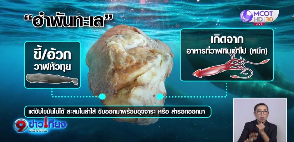 สำหรับอำพันทะเล คือ ขี้/อ้วก ของวาฬหัวทุย เกิดจากอาหารที่วาฬกินเข้าไป จำพวกหมึก แต่ร่างกายของวาฬ ไม่สามารถขับไขมันจากปลาหมึกได้ ทำให้ไขมันของหมึกสะสมอยู่ในลำไส้ จนร่างกายขับถ่ายไขมันส่วนนี้ออกมาพร้อมอุจจาระ หรือสำรอกไขมันออกมาลอยอยู่ในทะเล ซึ่งอำพันทะเล จะถูกนำไปใช้ในการผลิตน้ำหอม เพราะมีคุณสมบัติช่วยให้น้ำหอมมีกลิ่นคงทน. – สำนักข่าวไทย