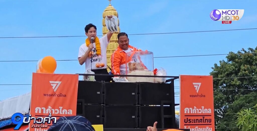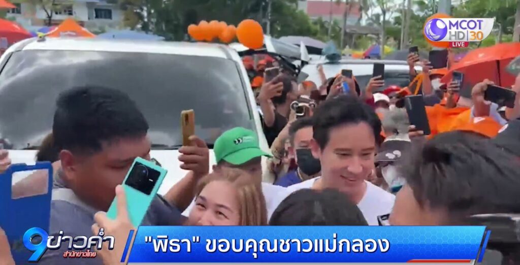 บรรยากาศที่ลานหน้าศาลากลางจังหวัดสมุทรสงคราม นายพิธา ลิ้มเจริญรัตน์ หัวหน้าพรรคก้าวไกล ลงจากรถตู้เพื่อขึ้นรถหกล้อติดตั้งเครื่องเสียง พร้อมด้วยนายณัฐชา บุญไชยอินสวัสดิ์ และ น.ส.รัชนก ศรีนอก ส.ส. กรุงเทพมหานคร พรรคก้าวไกล รวมทั้ง นายอานุภาพ ลิขิตอำนวยชัย ส.ส.สมุทรสงคราม ท่ามกลางบรรดาแฟนคลับนับร้อย ซึ่งมายืนรอกลางแดดจัด ส่งเสียงกรี๊ด และพยายามจะเบียดเสียดเข้าไปหานายพิธา ทำให้เจ้าหน้าที่ต้องประกาศให้ถอยออก แฟนคลับหลายคนนำของที่ระลึกเข้าไปมอบให้