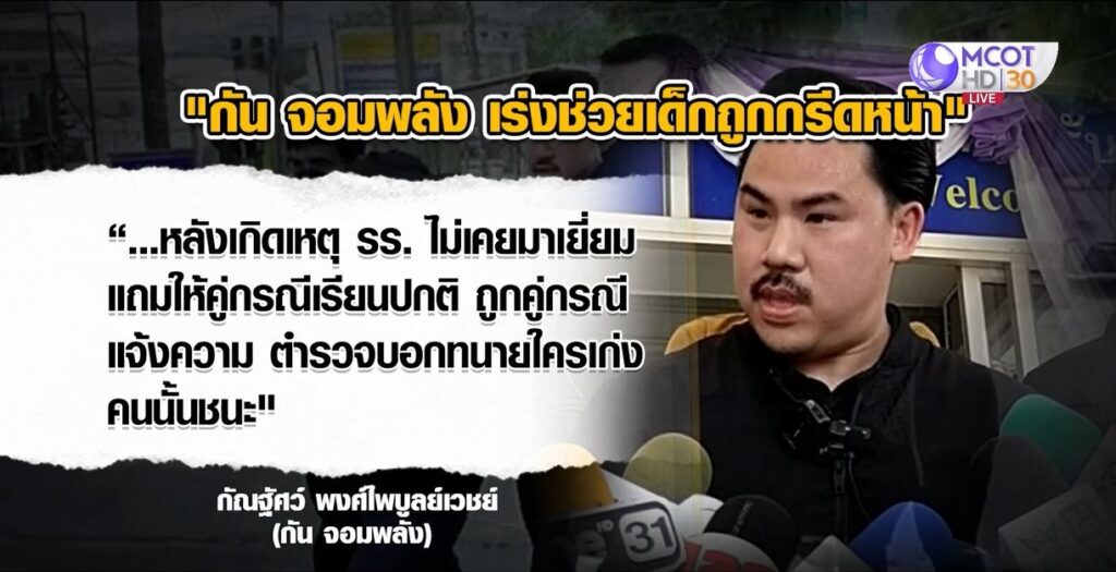 หลังพูดคุยกันเสร็จ กัน จอมพลัง ออกมาให้ข้อมูลว่า น้องผู้เสียหายร้องขอความช่วยเหลือไปทางเพจ บอกว่า ทะเลาะกับเพื่อนและถูกเพื่อนเอาคัตเตอร์กรีดหน้าตั้งแต่เบ้าตาถึงคอ ลึกไปที่ท้องและแขน ซึ่งน้องมีหลายอย่างที่ไม่สบายใจ ทั้งกรณีที่โรงเรียนไม่ยอมเรียกรถพยาบาลแต่เอารถโรงเรียนไปส่งเอง และครูยังแจ้งพยาบาลว่าเป็นอุบัติเหตุ