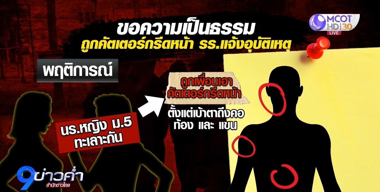 สุราษฎร์ธานี 28 มิ.ย. – นักเรียนหญิง ม.5 ที่สุราษฎร์ฯ ร้องขอความเป็นธรรม ถูกเพื่อนใช้คัตเตอร์กรีดหน้า โรงเรียนพยามยามกลบข่าวทำให้เป็นอุบัติเหตุ