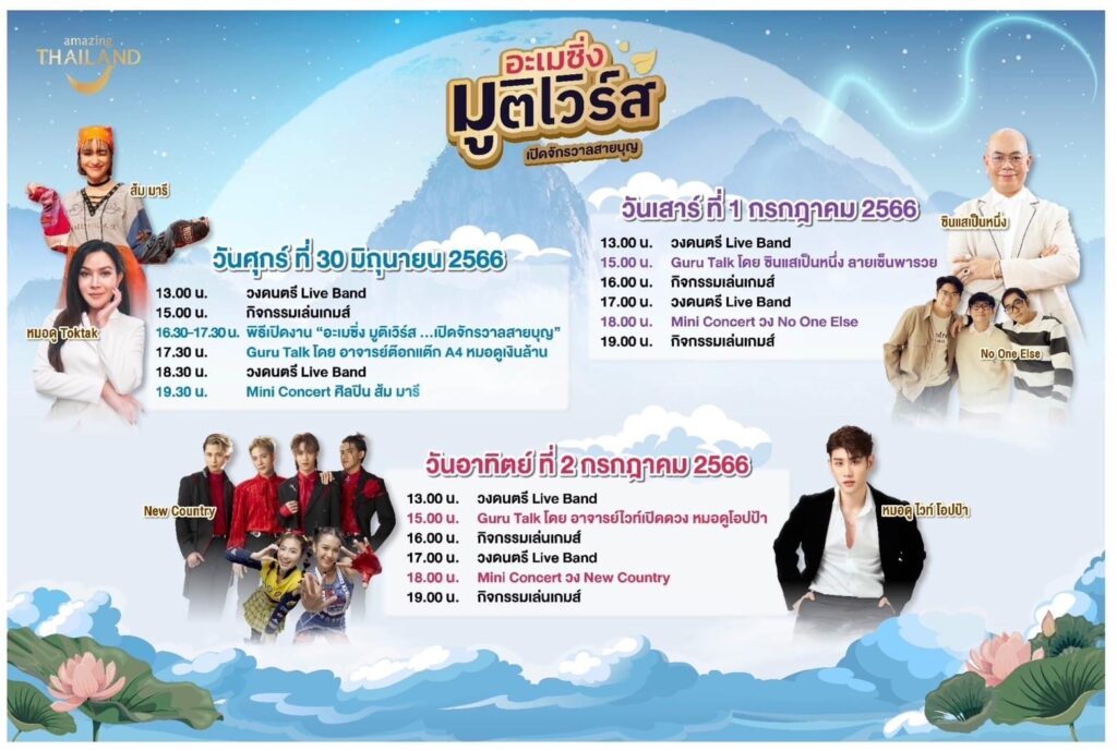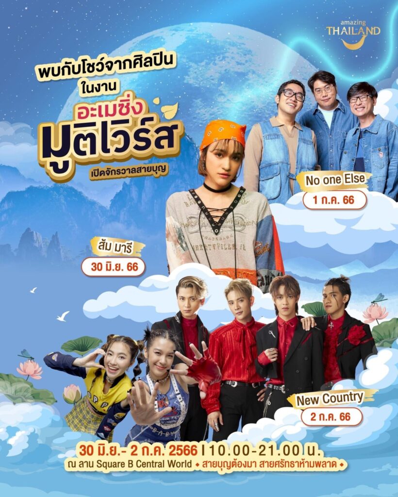 การท่องเที่ยวแห่งประเทศไทย (ททท.) เปิดงาน “อะเมซิ่ง มูติเวิร์ส: เปิดจักรวาลสายบุญ” รวมสุดยอดสายมู สายบุญไว้ในงานเดียว พบกับ 12 เส้นทางท่องเที่ยวเสริมพลังบุญ 5 ภูมิภาค แลนด์มาร์กศักดิ์สิทธิ์จำลองจาก 3 จังหวัด พร้อมชิมช้อปตลาดสายมูและฟังเคล็ดลับชีวิตปังกับหมอดูสุดฮอตแห่งยุค อ.ต๊อกแต๊ก A4 ซินแสเป็นหนึ่ง และ อจ.ไวท์ หมอดูโอปป้า ก่อนสนุกสนานไปกับการแสดงจากศิลปินชั้นนำของเมืองไทย ระหว่างวันที่ 30 มิถุนายน – 2 กรกฎาคม2566 ณ ลานหน้าห้างสรรพสินค้าเซ็นทรัลเวิลด์