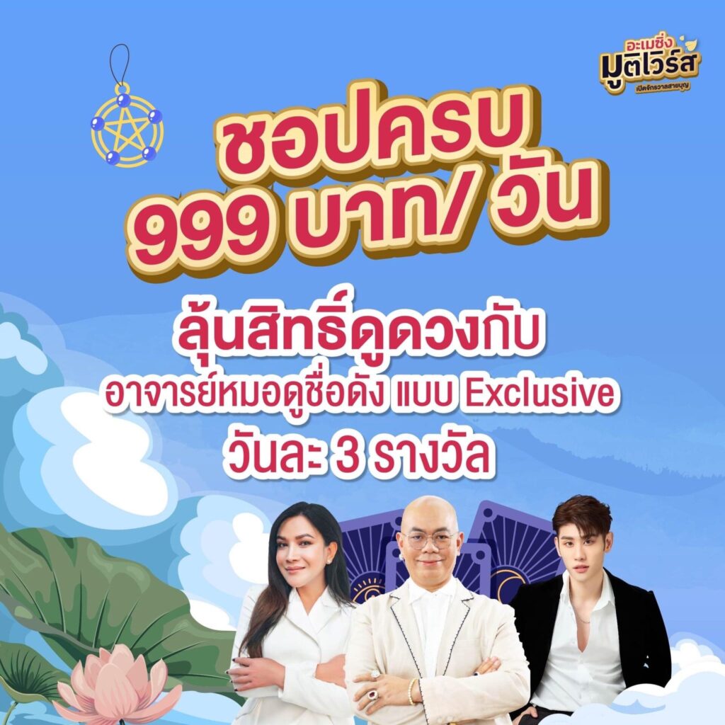 พิเศษ! สุด ๆ เพียงซื้อสินค้าภายในงานครบ 999 บาท ลุ้นรับสิทธิ์ดูดวงแบบ Exclusive กับหมอดูชื่อดังพิเศษวันละ 3 สิทธิ์เท่านั้น ไม่เพียงเท่านั้นผู้ร่วมงานที่ซื้อสินค้าครบทุก 500 บาท สามารถลุ้นรับสิทธิ์เข้าร่วมทริปเดินทางเสริมพลังบุญหนุนพลังใจ จำนวน 2 เส้นทาง กับอาจารย์ไวท์หมอดูโอปป้า ได้แก่ เส้นทางมูเปิดดวงเศรษฐี 789 จังหวัดสระบุรีและเส้นทางกรุงเทพฯ One Day Trip เปลี่ยนดวงชะตาร้ายเป็นดีแบบฉับพลัน และส่งท้ายไปบรรยากาศแห่งความสนุกใน โซนกิจกรรมบนเวที ไปกับการแสดงของศิลปินชื่อดังของเมืองไทย ได้แก่ ส้มมารี, วง NO ONE ELSE วงNew Country