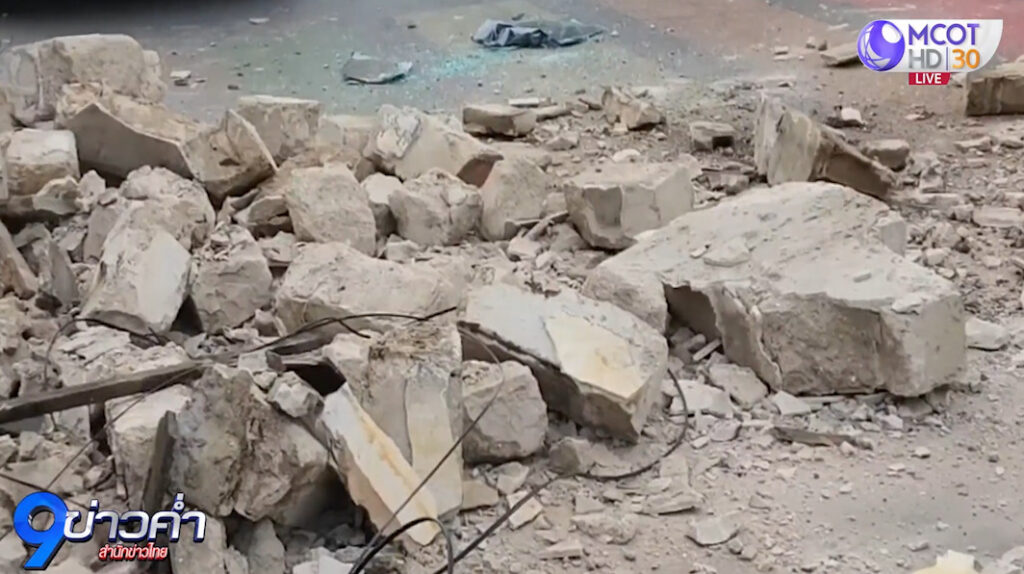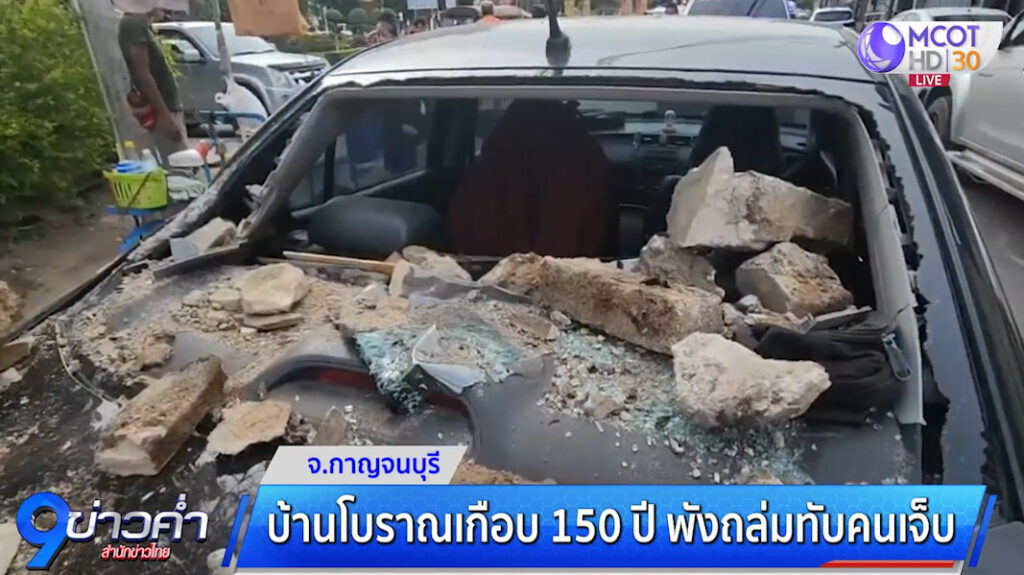 บ้านปูนโบราณพังถล่มเหลือแต่กำแพง 2 ด้าน ริมถนนปากแพรก ย่านตลาดเก่าเมืองกาญจนบุรี หลังจากเจ้าหน้าที่มูลนิธิพิทักษ์กาญจน์ รับแจ้งจากศูนย์วิทยุสถานีตำรวจภูธรเมืองกาญจนบุรีรีบเข้าตรวจสอบ พบภายในบ้านยังมีผู้ได้รับบาดเจ็บเป็นหญิงอายุประมาณ 40 ปี ถูกเศษปูนกระแทกใส่ เจ็บแน่นหน้าอก เจ้าหน้าที่รีบปฐมพยาบาลและนำตัวส่งโรงพยาบาลพหลพลพยุหเสนา