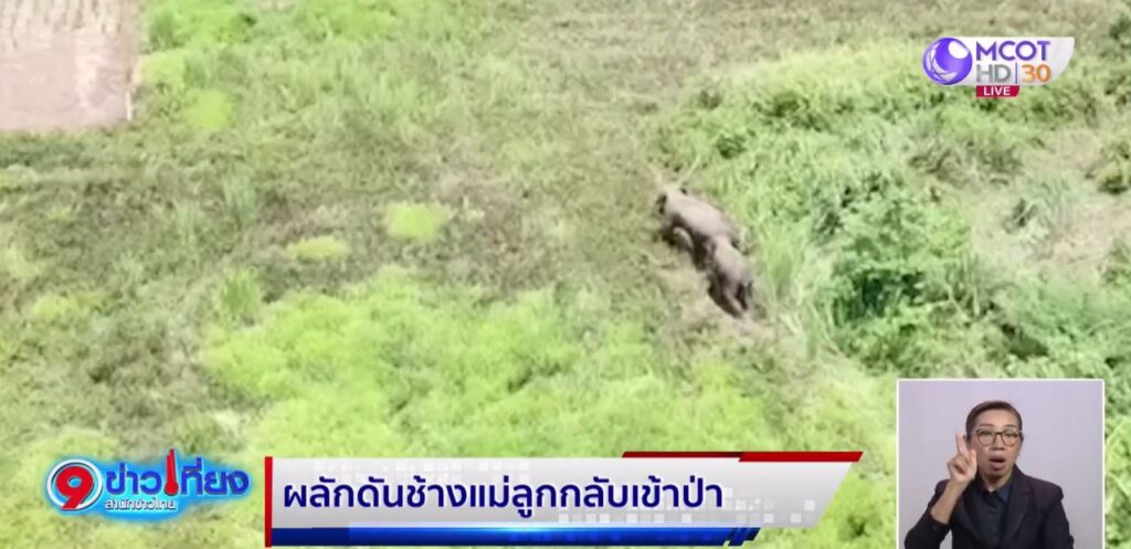 ภาพมุมสูงจะเห็นว่า เจ้าหน้าที่ต้องใช้รถแบ็กโฮ รถน้ำเทศบาลภูเรือ ไล่ต้อนช้างแม่ลูก ซึ่งลูกเดินตามแม่ไม่ห่าง โดยการพลักดันช้างต้องเป็นไปอย่างละมุนละม่อม เพราะอยู่ในเขตชุมชนใกล้บ้านเรือนประชาชน
