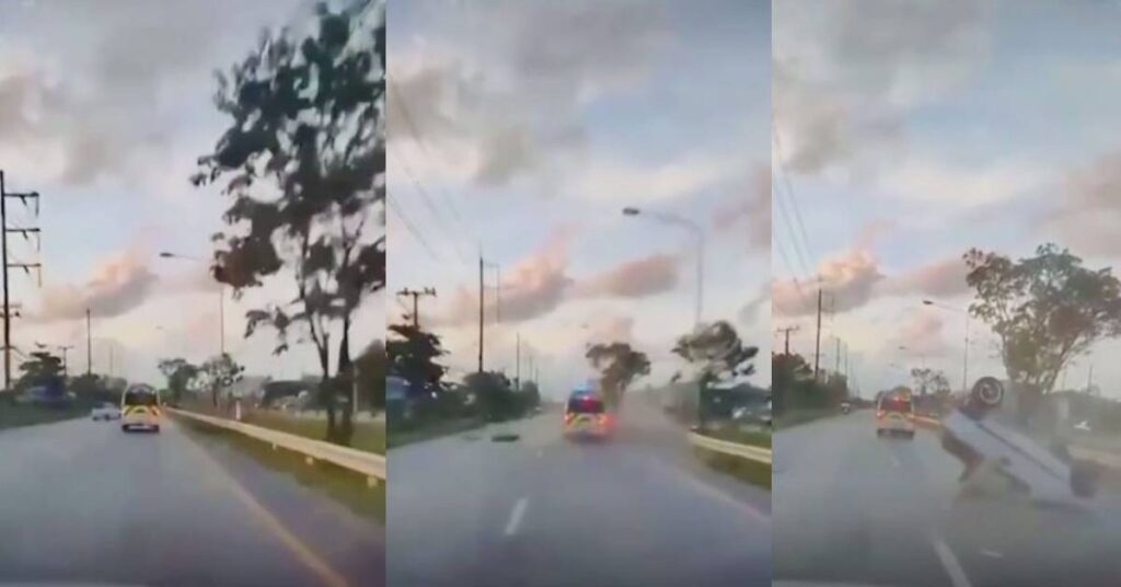 คลิปจากกล้องหน้ารถกู้ภัยสว่างพรกุศลระยอง ที่แล่นตามหลังกันเพื่อรีบไปช่วยผู้ประสบอุบัติเหตุรถคว่ำ ได้ขับชนรถเก๋งสีขาว จนรถกระเด็นหงายท้อง แรงกระแทกทำให้หญิงคนขับรถเก๋ง กระเด็นหลุดจากรถตกลงไปในร่องน้ำกลางถนนเสียชีวิต
