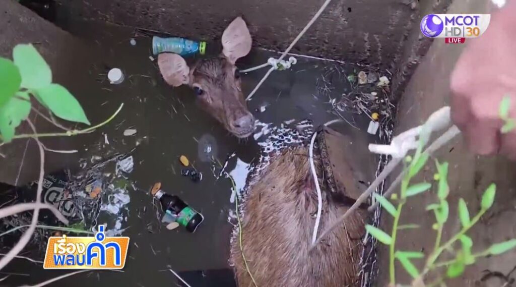 ส่วนกวางอีกตัวที่ตกลงไปในท่อระบายน้ำหน้าร้าน ส่งเสียงร้องด้วยอาการตกใจเช่นกัน ตามลำตัวมีแผลถลอกจากการขูดกับท่อระบายน้ำ ถูกตะปูที่ติดอยู่กับไม้ในท่อระบายน้ำตำลำตัว และพยายามหาทางขึ้นจากท่อตลอดเวลา เจ้าหน้าที่จึงใช้รถแบ็กโฮช่วย และใช้เชือกคล้องลำตัว เอาผ้าปิดหัวกวางเพื่อลดอาการตื่นตกใจ และนำตัวขึ้นมาได้ ซึ่งใช้เวลาพอๆ กับตัวแรก . – สำนักข่าวไทย