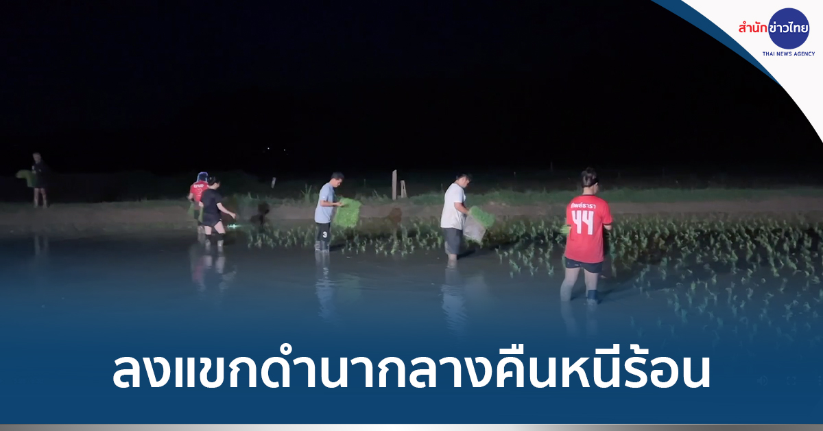 ภาพที่เห็นนี้เป็นชาวบ้าน บ้านโนนผาพุงพัฒนา ตำบลเขาหลวง อำเภอวังสะพุง จังหวัดเลย เปิดไฟส่องลงไปที่ทุ่งนา เพื่อดำนาในช่วงกลางคืน นายยงยุทธ กันพนม อาจารย์โรงเรียนเขาหลวงวิทยา เปิดเผยว่า กลางวันอากาศค่อนข้างร้อน จึงคิดหาวิธีดำนาอย่างไรถึงสบายขึ้น เมื่อสัปดาห์ที่ผ่านมา จึงลองเปลี่ยนมาดำนาช่วงกลางคืนชิมราง รู้สึกว่า ดี ไม่ร้อน เทียบกับกลางวันแล้ว ทำงานได้มากกว่ากลางวัน เพราะอากาศเย็น จึงไม่ต้องพักบ่อย ส่วนคนที่มาช่วยก็ขอแรงญาติพี่น้องลูกหลาน ซึ่งปกติ ในช่วงกลางวัน ทุกคนต่างก็มีภาวะ แต่ว่างกลางคืน โดยหลังเสร็จภารกิจของแต่ละคน ก็มาช่วยกัน ล้อมวงกินข้าวแล้วช่วยกันลงแขกดำนา .-สำนักข่าวไทย