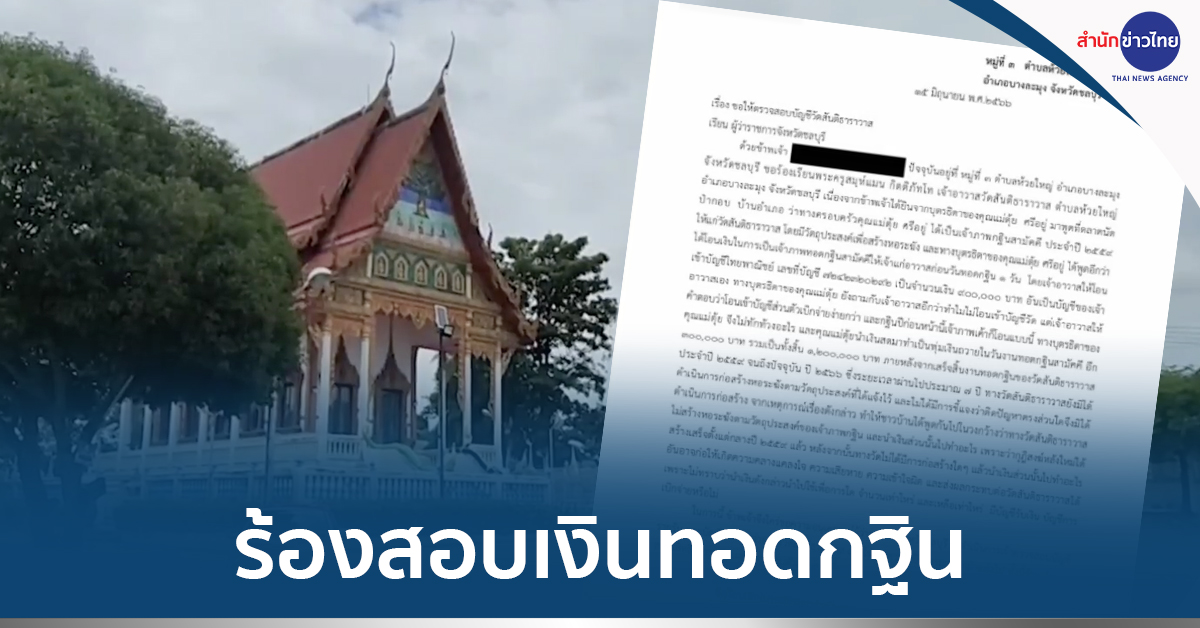 ชลบุรี 29 ก.ค.-ชาวบ้าน อ.บางละมุง จ.ชลบุรี ร้องผู้ว่าฯ สอบเจ้าอาวาสวัดสันติธาราวาส ปมเงินทอดกฐินสร้างหอระฆัง ผ่านไป 7 ปี วัดยังไม่มีการก่อสร้างหอระฆังเลย