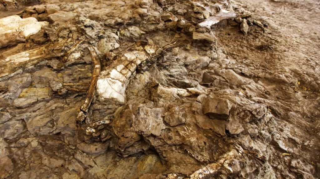 นักบรรพชีวินวิทยาขุดค้นซากดึกดำบรรพ์หรือฟอสซิลโครงกระดูกไดโนเสาร์ที่สมบูรณ์ที่สุดตัวหนึ่งของไทยและเอเชียตะวันออกเฉียงใต้ ที่แหล่งซากดึกดำบรรพ์ภูน้อย ต.ดินจี่ อ.คำม่วง จ.กาฬสินธุ์