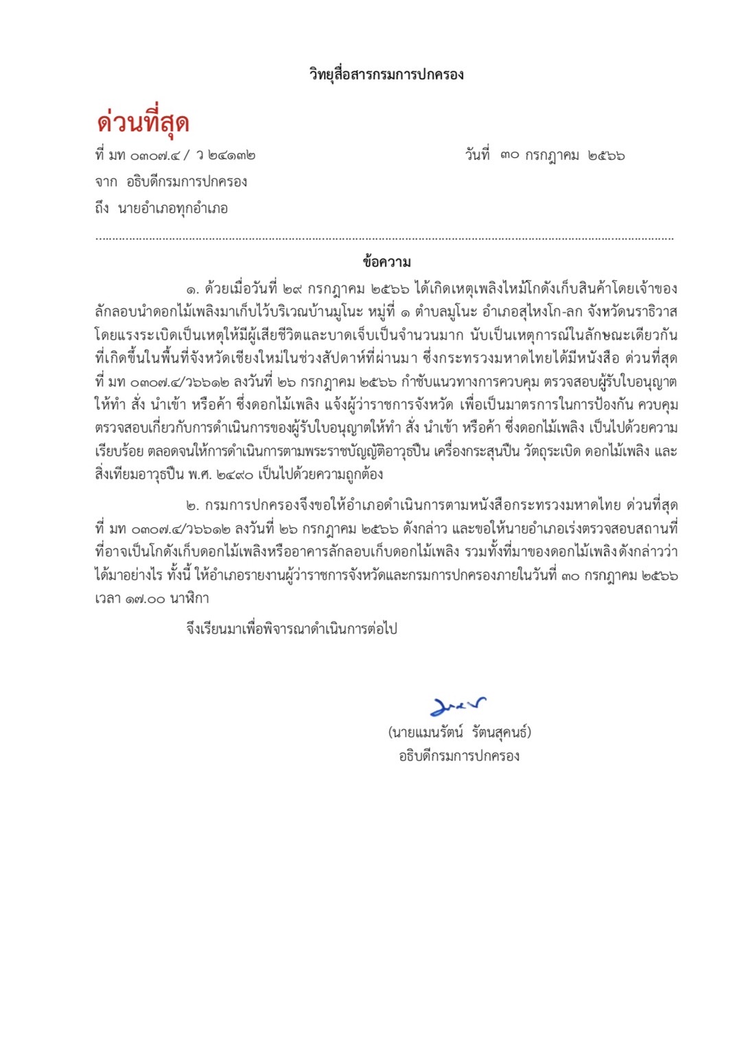 นายแมนรัตน์ รัตนสุคนธ์ อธิบดีกรมการปกครอง เปิดเผยว่า วันนี้ (30 ก.ค.66) ตนได้ลงนามในโทรสารสั่งการนายอำเภอทั้ง 878 อำเภอทั่วประเทศ ถึงกรณีที่เกิดเหตุเพลิงไหม้โกดังเก็บสินค้า ซึ่งเจ้าของลักลอบนำดอกไม้เพลิงมาเก็บไว้ บริเวณบ้านมูโนะ หมู่ที่ 1 ตำบลมูโนะ อำเภอสุไหงโก-ลก จังหวัดนราธิวาส ซึ่งแรงระเบิดเป็นเหตุให้มีผู้เสียชีวิตและบาดเจ็บจำนวนมาก นับเป็นเหตุการณ์ในลักษณะเดียวกับที่เกิดขึ้นในพื้นที่จังหวัดเชียงใหม่ ในช่วงสัปดาห์ที่ผ่านมา