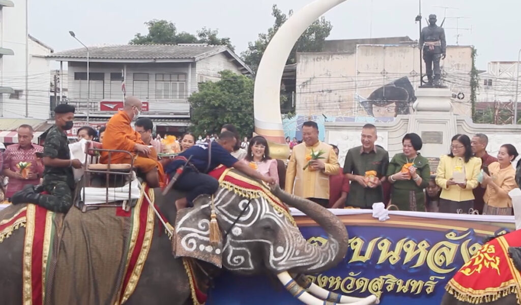 ส่วนที่อนุสาวรีย์พระยาสุรินทร์ภักดีศรีณรงค์จางวาง ถนนกรุงศรีนอก เขตเทศบาลเมืองสุรินทร์ ประชาชนและนักท่องเที่ยว ร่วมตักบาตรบนหลังช้าง เนื่องในวันสำคัญทางพระพุทธศาสนา วันอาสาฬหบูชา ซึ่งจัดขึ้นแห่งเดียวในโลก มีพระเถระชั้นผู้ใหญ่ พระสงฆ์ 71 รูป นั่งหลังช้าง 37 เชือก ออกรับบิณฑบาตร นอกจากตักบาตรแล้ว นักท่องเที่ยวยังบริจาคเงิน ทำบุญเลี้ยงอาหารช้าง ถ่ายรูปกับช้างอย่างใกล้ชิด เชื่อว่าช้างเป็นสัตว์มงคล ที่อยู่คู่ประเทศไทย .-สำนักข่าวไทย