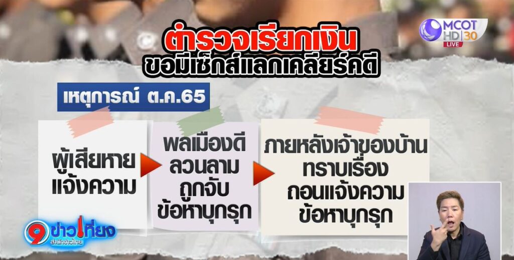 กรณีหญิงสาวถูกตำรวจเรียกเงิน 1 แสนบาท แลกกับการไม่ถูกดำเนินคดี ฐานบุกรุกเคหสถานในเวลากลางคืน จากนั้นตำรวจขอมีสัมพันธ์ชู้สาว เหตุการณ์นี้เกิดขึ้นเมื่อเดือนตุลาคม ปี 2565 พื้นที่จังหวัดสระบุรี ขณะผู้เสียหายกำลังกลับบ้านช่วงกลางคืน จังหวะที่รถยนต์เสียแบตเตอรี่หมด โทรศัพท์มือถือแบตหมด มีพลเมืองดีเข้ามาช่วยเหลือช่วยเข็นรถยนต์ให้ แต่เข็นเข้าไปในที่เปลี่ยว อ้างว่าจะพาไปเอาแกลอนมาซื้อน้ำมันเติมรถที่บ้าน และเอาสายชาร์จโทรศัพท์ให้ ชายคนดังกล่าว บอกว่าให้เดินไปหยิบสายชาร์จในห้อง จากนั้นก็เข้ามาล็อกห้องและพยายามลวนลาม เหยื่อสาวจึงออกอุบายขอเข้าห้องน้ำ และหลบหนีออกมาได้ โดยปีนรั้วหนีไปยังบ้านข้างๆ แต่ถูกเจ้าของบ้านหลังที่หนีเข้าไป แจ้งข้อหาบุกรุกเคหสถานในเวลากลางคืน เพราะตกใจที่เข้ามาช่วงกลางดึก จึงถูกคุมมาดำเนินคดี