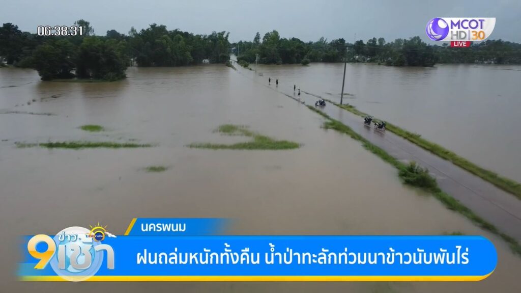 ตลอดทั้งคืนที่ผ่านมา ยังมีฝนตกหนักต่อเนื่อง ทำให้มีปริมาณฝนเฉลี่ยสะสม สูงเกือบ 100 มิลลิเมตร โดยเฉพาะพื้นที่ อ.ธาตุพนม รวมถึง อ.นาแก มีปริมาณน้ำฝนสูงประมาณ 80-90 มิลลิเมตร บวกกับเป็นพื้นที่ติดกับเทือกเขาภูพานน้อย และติดกับลำน้ำสาขาสำคัญของแม่น้ำโขง ทำให้ได้รับผลกระทบจากน้ำป่าทะลัก หนักสุด คือ พื้นที่ ต.ฝั่งแดง, ต.นาหนาด อ.ธาตุพนม และ ต.พุ่มแก อ.นาแก บางส่วนได้รับผลกระทบจากน้ำป่าทะลักล้นลำห้วยกุดโดน เอ่อท่วมพื้นที่นาข้าวของเกษตรกร ที่เพิ่งปักดำเกือบ 1,000 ไร่ หากยังมีปริมาณฝนตกต่อเนื่อง ระดับน้ำไม่ลด อีกประมาณ 1 สัปดาห์ คาดว่าจะทำให้นาข้าวได้รับเสียหายเป็นพื้นที่กว้าง