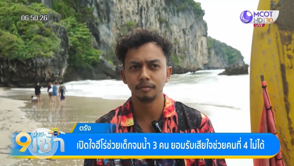 ตรัง 2 ส.ค. – เปิดใจฮีโร่หนุ่มวัย 28 ปี ช่วยชีวิตเด็กถูกคลื่นซัดจมน้ำได้ 3 คน เสียใจช่วยน้องคนที่ 4 ไม่ได้ เผย 4-5 ปี มานี้ ใช้เซิร์ฟบอร์ดช่วยชีวิตนักท่องเที่ยวจมน้ำได้กว่า 10 คน