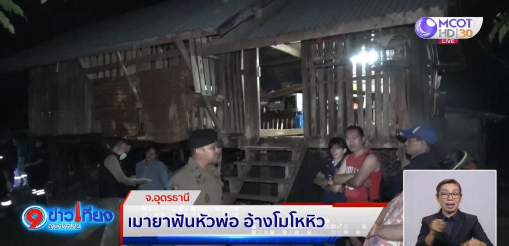 ตำรวจ สภ.โนนสูง อ.เมือง จ.อุดรธานี รับแจ้งเหตุลูกใช้มีดฟันพ่อเสียชีวิต ที่กระท่อมนาท้ายบ้านโนนมะเขือ จึงนำกำลังเข้าตรวจสอบ พร้อมแพทย์เวร โรงพยาบาลศูนย์อุดรธานี อาสากู้ภัยมูลนิธิอุดรสว่างเมธาธรรม ที่เกิดเหตุเป็นเถียงนาไม้ยกพื้นสูงใน ต.บ้านตาด อ.เมือง จ.อุดรธานี หลังเถียงนา พบศพนายอุบล อายุ 57 ปี นอนคว่ำหน้าจมกองเลือดที่พื้นดิน สภาพศพไม่สวมเสื้อ สวมกางเกงขาสั้นสีน้ำเงิน ใส่รองเท้าแตะ ถูกฟันด้วยของมีคมที่หัวด้านหลัง 1 แผล ลึกถึงกะโหลก พบมีดพร้าวางอยู่ข้างโอ่งน้ำ จึงเก็บเป็นหลักฐาน ส่วนผู้ก่อเหตุ คือ นายอุ้มบุญ อายุ 32 ปี ลูกชายผู้ตาย หลังก่อเหตุอาบน้ำเปลี่ยนเสื้อผ้า นั่งอยู่บนเถียงนา