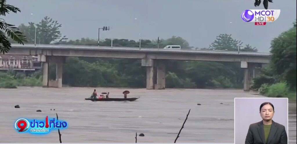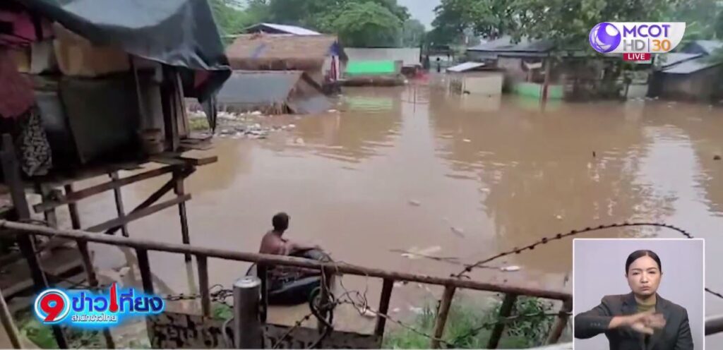 พื้นที่ชายแดนอำเภอแม่สอด จ.ตาก ฝนตกหนักสะสมนาน 3 วัน ครอบคลุมพื้นที่ 5 อำเภอแนวชายแดน จ.ตาก ตลอดทั้งคืนต่อเนื่องถึงช่วงเช้า ส่งผลให้แม่น้ำเมย ซึ่งเป็นแม่น้ำที่กั้นแนวพรมแดนระหว่างไทย-เมียนมา ระดับน้ำเมยเพิ่มสูงขึ้นอย่างรวดเร็ว ที่จุดตรวจวัดระดับน้ำใต้สะพานมิตรภาพไทย-เมียนมาแห่งที่ 1 ด่านพรมแดนถาวรแม่สอดแห่งที่ 1 บ้านริมเมย อ.แม่สอด จ.ตาก เช้านี้ระดับแม่น้ำเมยสูงกว่า 5 เมตร เตือนภัยสีแดงขั้นอันตราย เพราะมีมวลน้ำป่ามหาศาล สีแดงขุ่นและไหลเร็วทะลักล้นตลิ่งเข้าท่วมพื้นที่ริมตลิ่งแม่น้ำเมยตลอดแนวชายแดนทั้งฝั่งอำเภอแม่สอดและฝั่งจังหวัดเมียวดี เมียนมา จุดที่น่าห่วงอยู่ที่พื้นที่หมู่บ้านริมเมย ซึ่งเป็นพื้นที่ต่ำ บ้านจมน้ำไปกว่า 20 หลังแล้ว บางจุดระดับน้ำท่วมสูงกว่าครึ่งเมตร และไม่มีทีท่าว่าน้ำจะลดลง ชาวบ้านที่ท่าเรือขนส่งสินค้าตลอดแนวตลิ่งริมแม่น้ำเมย ต้องรีบขนของหนีน้ำกันอย่างโกลาหล