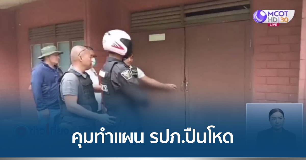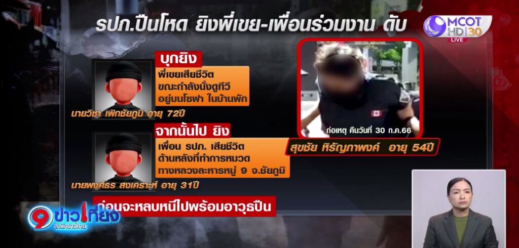 ชัยภูมิ 4 ส.ค. – ตำรวจชัยภูมิ คุมตัว รปภ.ปืนโหด จ่อยิง 2 ศพ ทำแผนประกอบคำรับสารภาพ อ้างถูกกดันจนบันดาลโทสะ