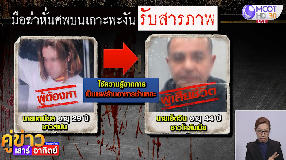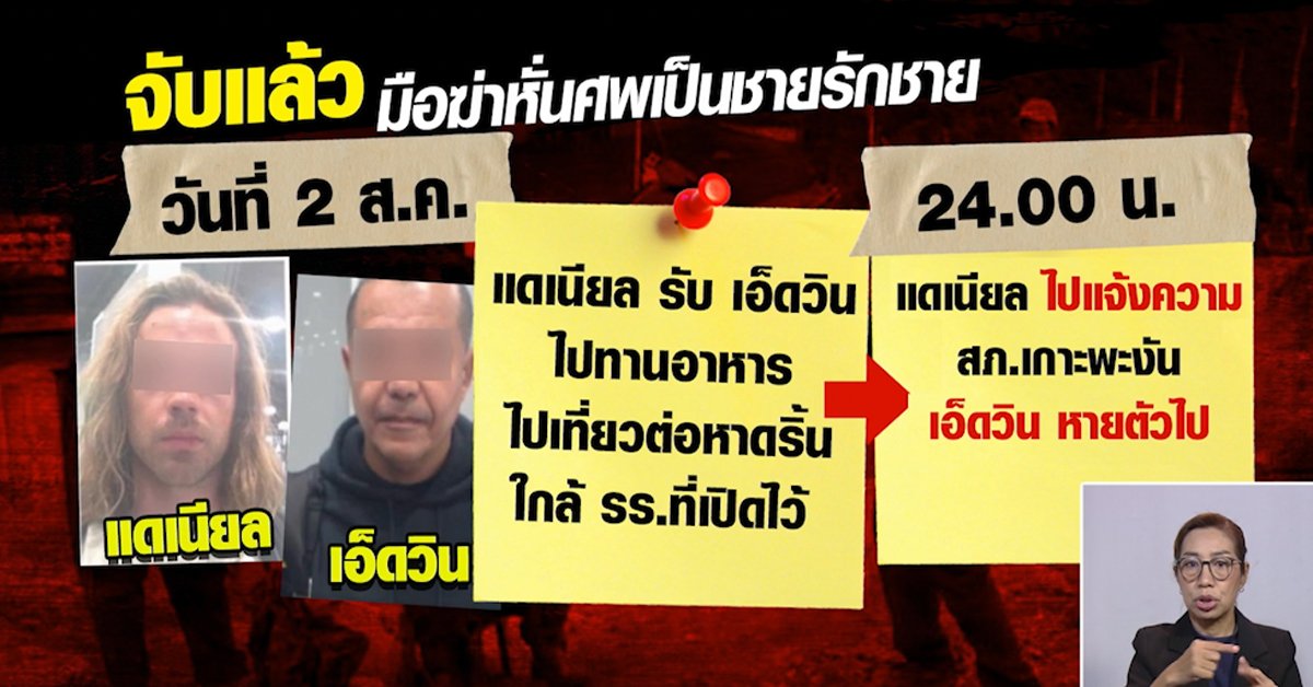 สุราษฎร์ธานี 5 ส.ค.-คดีสะเทือนขวัญบนเกาะพงัน จ.สุราษฎร์ธานี ที่พบชิ้นส่วนมนุษย์ในถุงขยะสีดำ ล่าสุดตำรวจควบคุมตัวฆาตกรโหดได้แล้วหลังก่อเหตุเพียง 2 วัน เป็นเชฟร้านดังชาวสเปน เพื่อนชายคนสนิทของผู้ตาย รับชำแหละก่อนใส่ถุงขยะทิ้ง