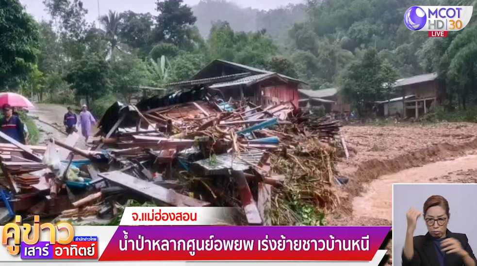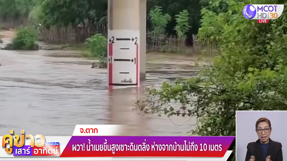 ที่พื้นที่ชายแดน อ.แม่สอด จ.ตาก พายุฝนตกลงมาอย่างหนักตลอดหนึ่งสัปดาห์และตกแบบมาราธอนครอบคลุมไปทั่วพื้นที่ 5 อำเภอ ทำให้แม่น้ำเมยที่กั้นพรมแดนไทย-เมียนมา มีระดับเพิ่มสูงจนถึงจุดสีแดงเตือนภัยกระแสน้ำเมยที่ไหลอย่างเชี่ยวกราก กัดเซาะดินริมตลิ่ง บ้านเรือนประชาชนพังทลายเป็นแนวยาว โดยเฉพาะที่บริเวณท้ายหมู่บ้านแม่กุใหม่ท่าซุง อ.แม่สอด เช้าวันนี้ได้รับผลกระทบหนักสุด ดินแนวตลิ่งริมแม่น้ำเมยถูกแม่น้ำเมยกัดเซาะอย่างหนัก ซึ่งพื้นที่เกิดเหตุดังกล่าวเป็นแนวโค้งของแม่น้ำและเป็นพื้นที่สุดเขตประเทศไทย