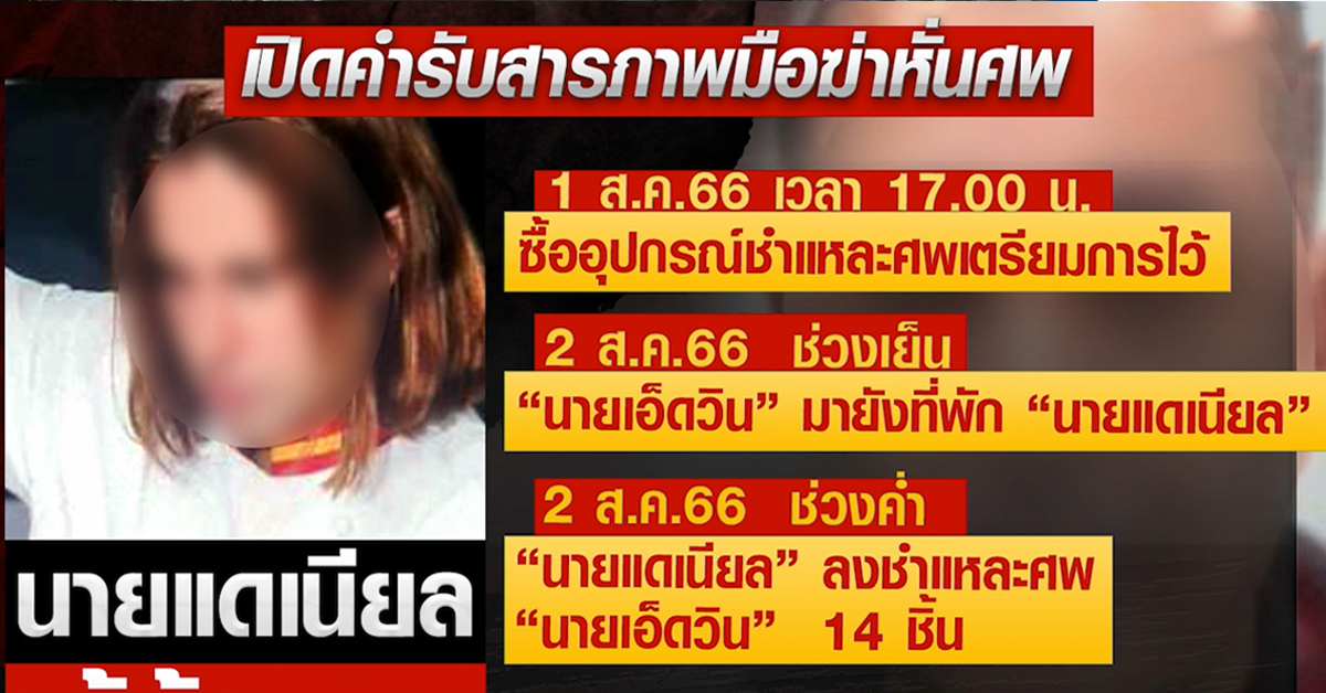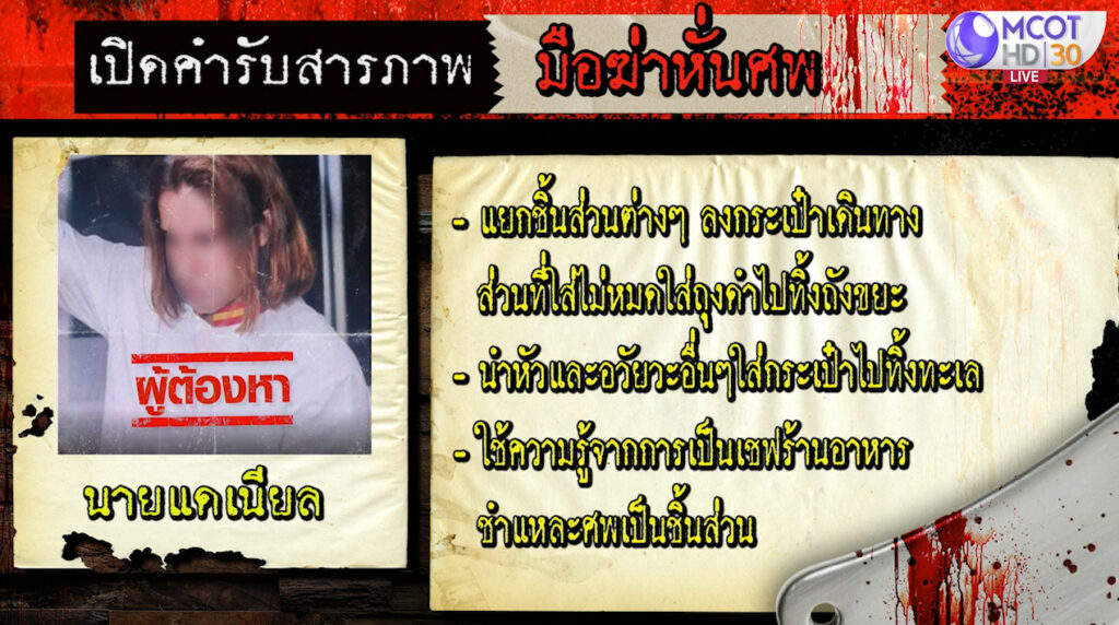 สุราษฎร์ธานี 5 ส.ค.-คดีสะเทือนขวัญบนเกาะพะงัน จ.สุราษฎร์ธานี หลังพบชิ้นส่วนอวัยวะชายชาวต่างชาติถูกทิ้งในกองขยะ ตำรวจคุมตัวเชฟชาวสเปนไปสอบปากคำ ล่าสุดเจ้าตัวรับสารภาพแล้วว่าเป็นคนก่อเหตุ โดยอาศัยความรู้จากการเป็นเชฟชำแหละศพ