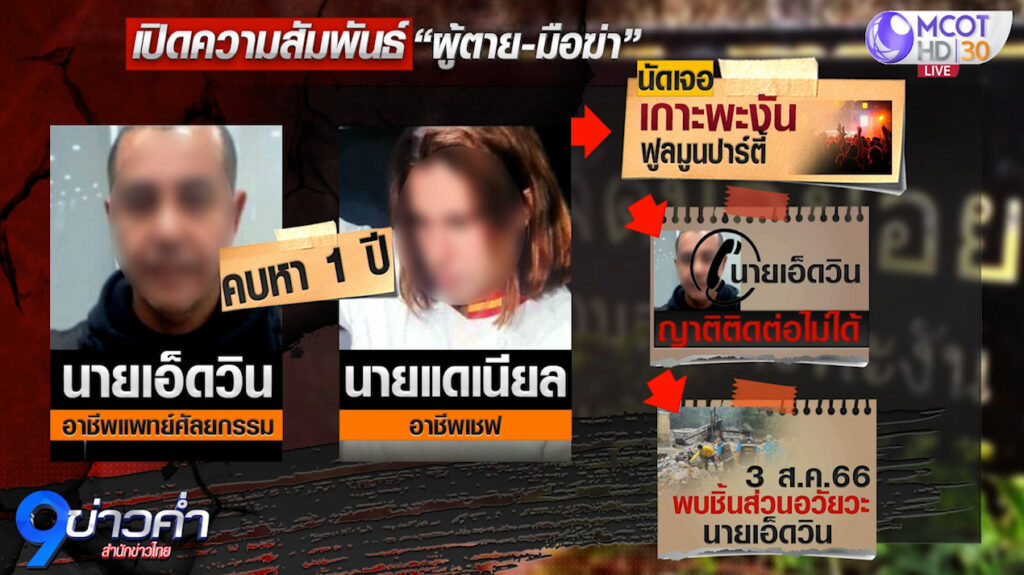 จากการพูดคุยกับญาตินายเอ็ดวินทราบว่า นายเอ็ดวินมีอาชีพเป็นแพทย์ศัลยกรรมเฉพาะทางด้านการผ่าตัดแปลงเพศที่ประเทศโคลอมเบียและคบหากับนายแดเนียลซึ่งเป็นเชฟที่มีชื่อเสียงของประเทศสเปนมานานกว่า 1 ปี โดยทั้งคู่นัดมาพบกันที่เกาะพะงันเพื่อร่วมงานฟูลมูนปาร์ตี้ แต่หลังจากที่นายเอ็ดวินมาถึงเกาะพะงันทางญาติก็ไม่สามารถติดต่อได้ เมื่อสอบถามนายแดเนียลก็บอกว่ายังไม่พบนายเอ็ดวินเหมือนกัน ทางญาติได้ตรวจสอบไปที่โรงแรมที่นายเอ็ดวินจองไว้ พบว่านายแดเนียลได้เข้าพักเพียงคนเดียวและได้เช็กเอาท์ออกไปก่อนที่นายเอ็ดวินจะเดินทางมาถึง จนกระทั้งวันที่ 3 ส.ค. ก็มาพบชิ้นส่วนอวัยวะของนายเอ็ดวิน