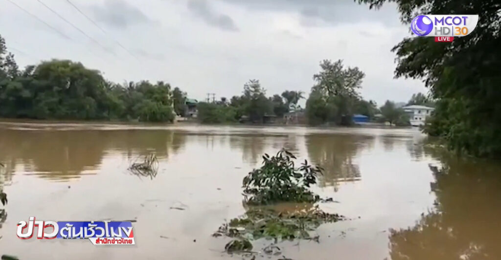 ฝนที่ตกหนักต่อเนื่องยังทำให้แม่น้ำเมยเอ่อล้นเข้าท่วมบ้านเรือนประชาชนในหมู่บ้านวังผา ตำบลแม่จะเรา อำเภอแม่ระมาด เจ้าหน้าที่นำเรือเข้าไปช่วยขนย้ายสิ่งของให้ประชาชน ขณะผู้ว่าฯ ตาก สั่งทุกฝ่ายพร้อมเฝ้าระวังสถานการณ์และเข้าช่วยเหลือประชาชนทันที.-สำนักข่าวไทย
