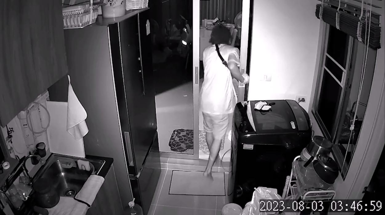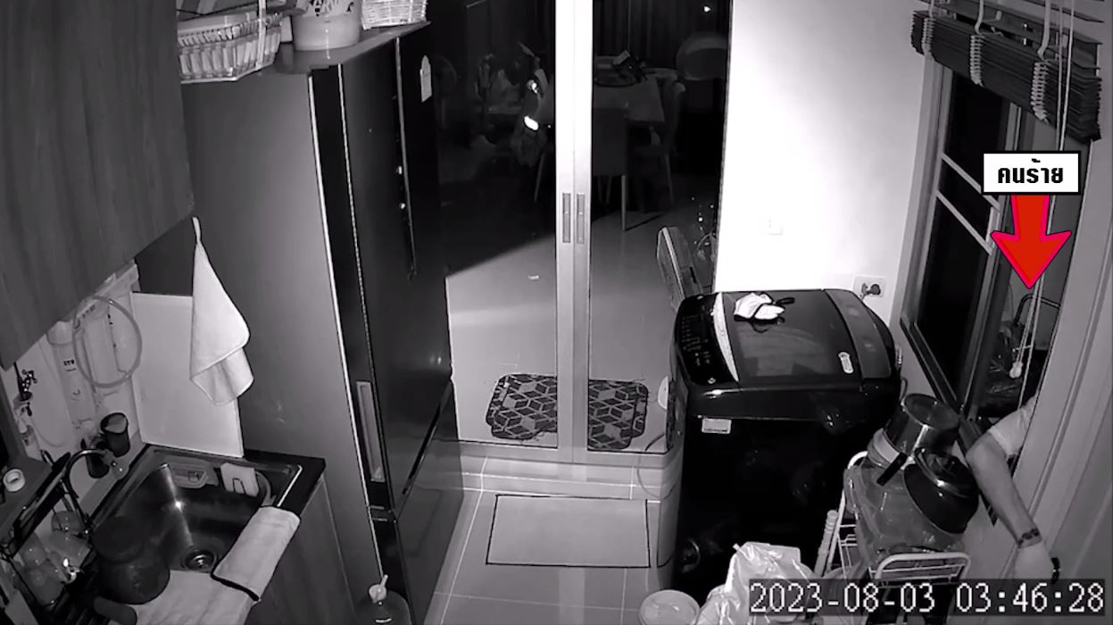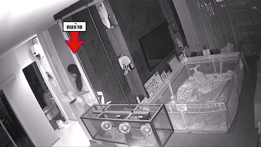 วงจรปิดเผยภาพคนร้ายเป็นชาย เอื้อมมือเข้ามาทางหน้าต่าง เพื่อเปิดประตูเข้ามาในบ้าน พอเปิดได้ คนร้ายก็ค่อยๆ ย่องเข้าไปในบ้าน และมองหาของมีค่า ที่หนักสุดคือ คนร้ายเดินเข้าไปในห้องนอน ที่มีพ่อ แม่ และลูกวัย 1 ขวบ กำลังนอนหลับอยู่บนเตียง ซึ่งคนร้ายก็ไม่หวั่นกลัว เดินไปหยิบกล่องใส่เงินสดที่วางอยู่ตรงหัวเตียง และเดินหยิบของรอบเตียง ได้ทรัพย์สินเป็นเงินสด กระเป๋า และพระเครื่อง