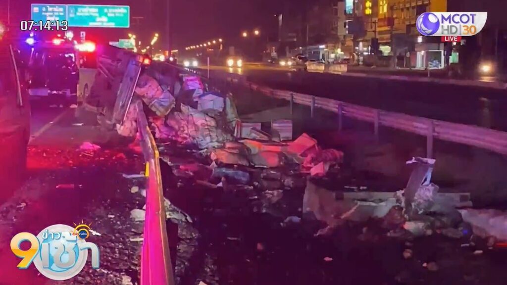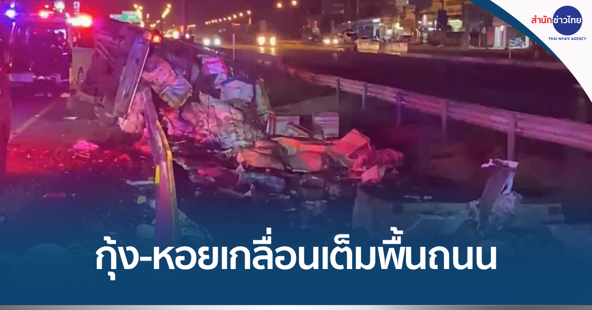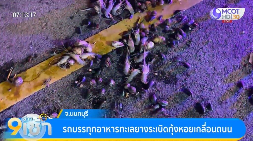 นนทบุรี 14 ส.ค. – รถบรรทุกอาหารทะเลยางระเบิด ก่อนเสียหลักชนราวเหล็กข้างทาง กุ้ง-หอยร่วงเกลื่อนเต็มพื้นถนน