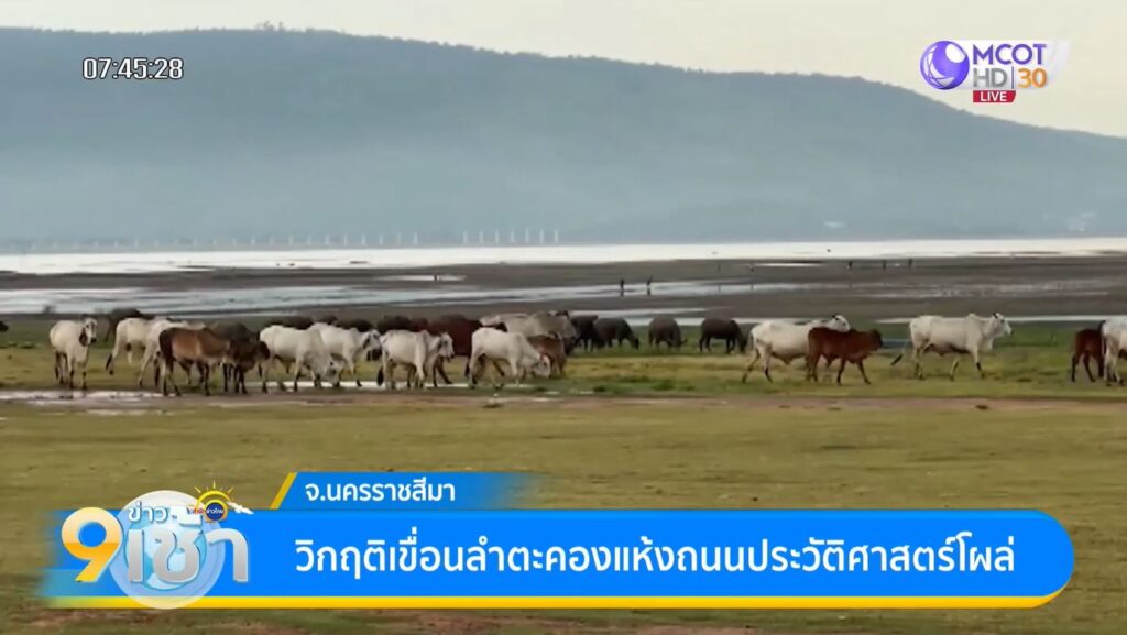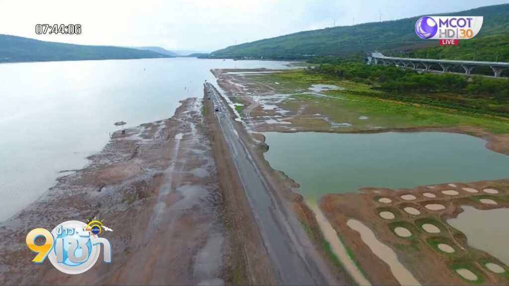 ภาพมุมสูงจะเห็นสถานการณ์น้ำในเขื่อนลำตะคอง จังหวัดนครราชสีมา วิกฤติจากภาวะภัยแล้งฝนทิ้งช่วง เป็นระยะเวลานาน จนทำให้ถนนมิตรภาพสายประวัติศาสตร์ที่เลิกใช้จากการก่อสร้างเขื่อนลำตะคอง เมื่อปี 2515 และจมอยู่ใต้น้ำในเขื่อน โผล่ขึ้นให้เห็นถนนลาดยางยาวกว่า 7 กิโลเมตร ประชาชนขับรถสัญจรไปมาได้ กลายเป็นทุ่งเลี้ยงสัตว์ และจับปลาของชาวบ้าน