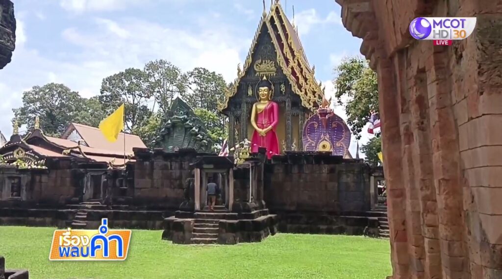 ศรีสะเกษ 23 ส.ค. – นักท่องเที่ยวแปลกใจพระพุทธรูปปางอะไร ตั้งข้างปราสาทหินเก่าแก่ สวมจีวร สีชมพูสดใส ทาปากแดง