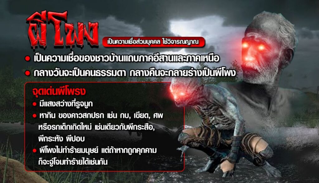 สำหรับผีโพง เป็นความเชื่อของชาวบ้านแถบภาคอีสานและภาคเหนือ คือผู้ที่เป็นผีโพง ในเวลากลางวันจะเป็นเหมือนคนธรรมดาทั่วไป แต่ตกกลางคืนจะกลายร่างเป็นผีโพง มีจุดเด่นคือมีแสงสว่างหรือดวงไฟที่รูจมูก ออกหาของกิน ได้แก่ ของสกปรกคาว เช่น กบ, เขียด, ศพ หรือรกเด็กเกิดใหม่ เช่นเดียวกับผีกระสือ ผีกระหัง หรือผีปอบ โดยปกติแล้วผีโพงจะไม่ทำร้ายคน แต่ถ้าหากถูกคุกคามจะจู่โจมทำร้ายได้เช่นกัน.-สำนักข่าวไทย