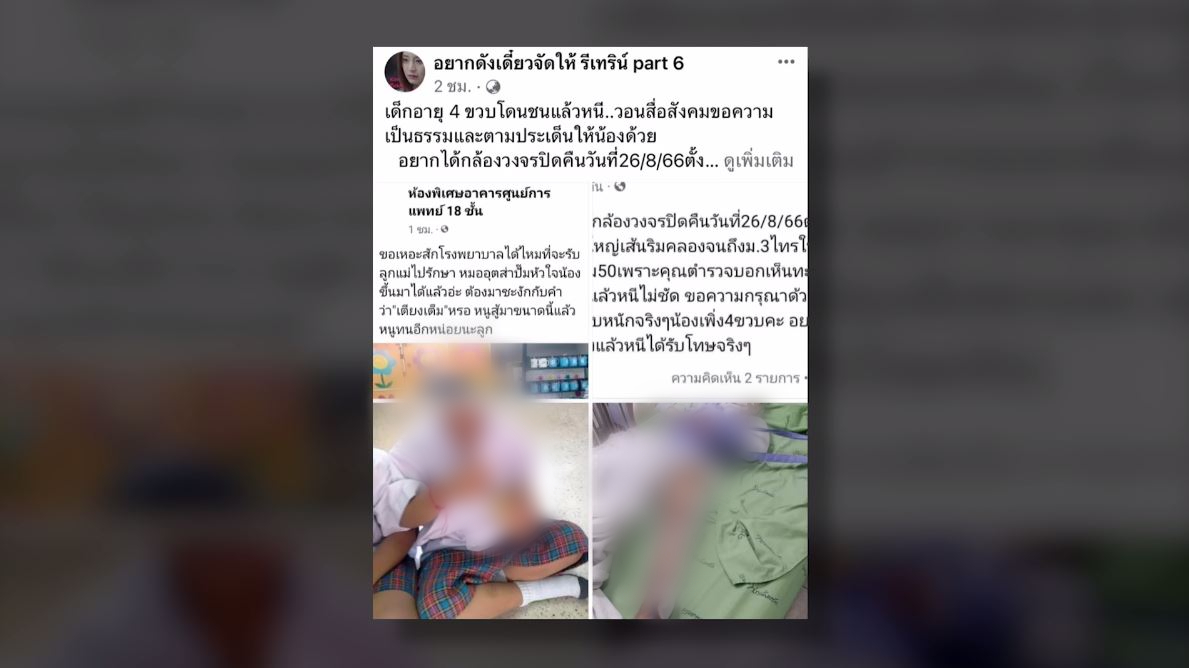 มีเรื่องราวหนึ่งถูกแชร์ในโลกออนไลน์ กรณีเพจอยากดังเดี๋ยวจัดให้ รีเทิรน์ part 6 โพสต์ภาพพร้อมระบุข้อความว่า “เด็กอายุ 4 ขวบ โดนชนแล้วหนี วอนสื่อสังคมขอความเป็นธรรมและตามประเด็นให้น้องด้วย อยากได้กล้องวงจรปิดคืนวันที่ 26 ส.ค.66 ตั้งแต่หมู่ 5 ไทรใหญ่ เส้นริมคลอง จนถึงหมู่ 3 ไทรใหญ่ ช่วงเวลา 20.50 น. เพราะคุณตำรวจบอกเห็นทะเบียนรถคนที่ชนแล้วหนีไม่ชัด ขอความกรุณาด้วยนะคะ ลูกเราเจ็บหนักจริงๆ น้องเพิ่ง 4 ขวบ อยากให้คนที่ชนน้องแล้วหนีได้รับโทษจริงๆ”