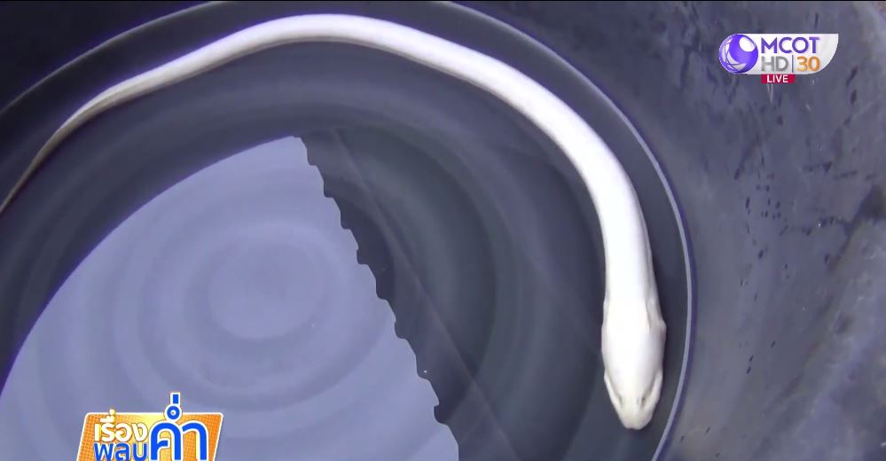 นายสมัคร บุญมาวงค์ อายุ 53 ปี เจ้าของบ้าน ที่ อ.เมือง จ.มุกดาหาร นำปลาไหลเผือกออกมาขังไว้ในกะละมังพลาสติก ลำตัวยาว 75 เซนติเมตร สีขาวนวล ส่วนที่ด้านหลังปลาไหลเผือกมีสีขาวใสจนเห็นเส้นเลือด ดวงตามีสีดำดูสวยงาม