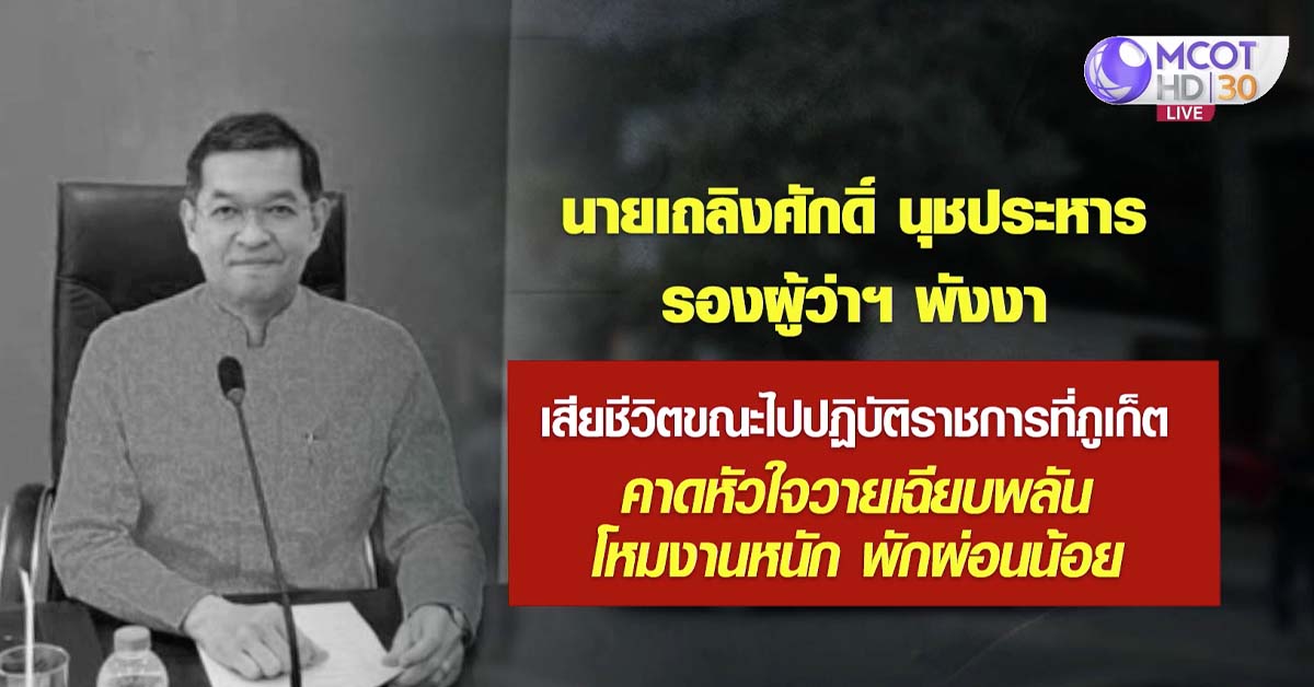 ภูเก็ต 3 ก.ย.-นายเถลิงศักดิ์ นุชประหาร รองผู้ว่าฯ พังงา เสียชีวิตอย่างกะทันหันขณะเดินทางมาปฏิบัติราชการที่จังหวัดภูเก็ต คาดโหมงานหนักพักผ่อนน้อย ทำให้หัวใจวายเฉียบพลัน
