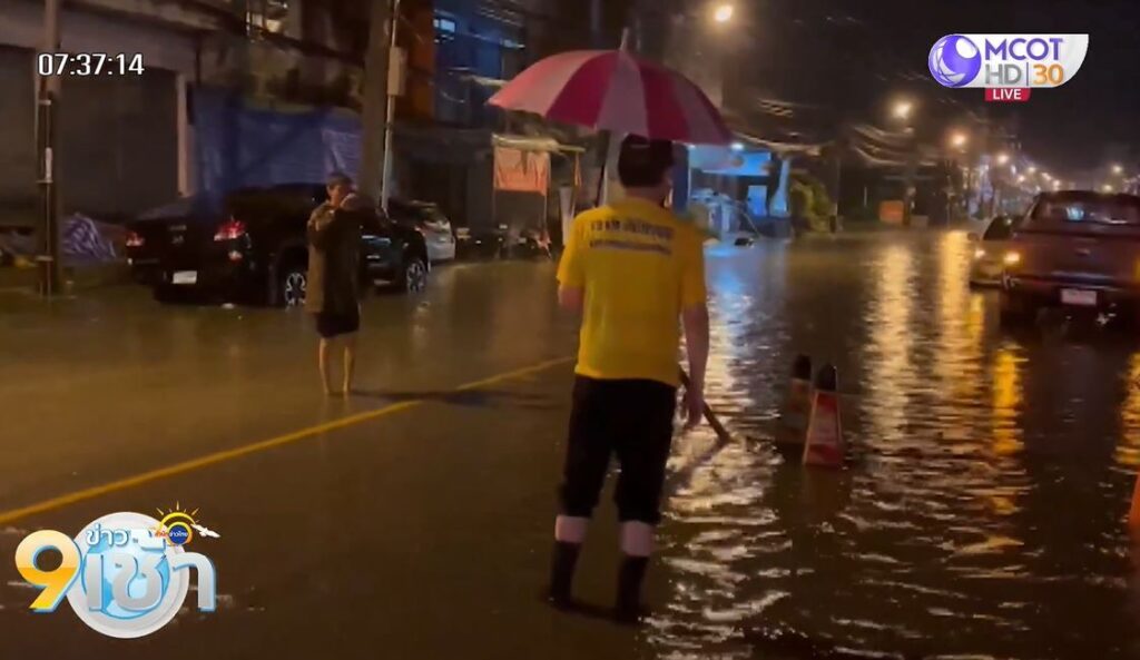 นครพนม 7 ก.ย. – จ.นครพนม ฝนเทกระหน่ำกลางดึกนานกว่าชั่วโมง น้ำเอ่อท่วมถนนในเขตเทศบาลเมือง ระดับน้ำสูงประมาณ 20-30 เซนติเมตร สร้างความเดือดร้อนให้กับประชาชน เจ้าหน้าที่เดินเครื่องสูบน้ำเร่งระบายลงน้ำโขง ป้องกันกระทบพื้นที่เศรษฐกิจ