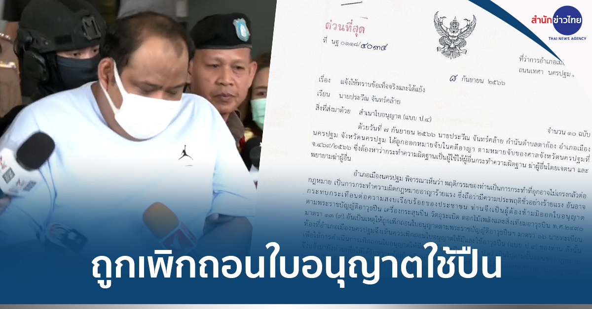 ท่านจึงเป็นผู้ต้องห้ามมิให้ออกใบอนุญาตตามพระราชบัญญัติอาวุธปืน เครื่องกระสุนปืน วัตถุระเบิด ดอกไม้เพลิงและสิ่งเทียมอาวุธปืน พ.ศ.2490 มาตรา 13 (9) อันเป็นเหตุให้ถูกเพิกถอนใบอนุญาตตามพระราชบัญญัติอาวุธปืนฯ มาตรา 66 นายทะเบียนท้องที่อำเภอเมืองนครปฐมจึงเห็นควรเพิกถอนใบอนุญาตให้มีและใช้อาวุธปืน (แบบ ป.4) ของท่าน ดังนั้น เพื่อให้การดำเนินการฯ เป็นไปตามขั้นตอนของกฎหมาย จึงแจ้งมายังท่านเพื่อให้ได้รับทราบข้อเท็จจริงอย่างเพียงพอ และมีโอกาสโต้แย้งและแสดงพยานหลักฐานต่อนายทะเบียนท้องที่อำเภอเมืองนครปฐมภายใน 7 วันนับวันที่ได้รับหนังสือ.-สำนักข่าวไทย