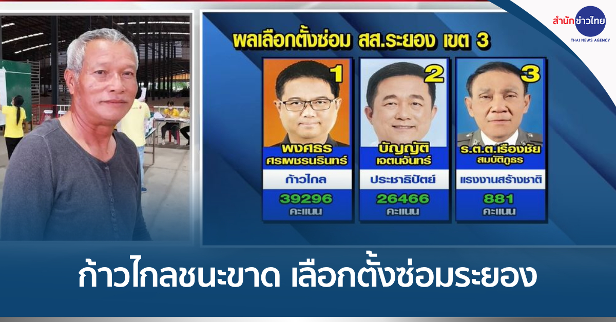 ระยอง 10 ก.ย. – นับครบแล้วทุกหน่วย ผลเลือกตั้งซ่อม สส.ระยอง เขต 3 อย่างไม่เป็นทางการ นายพงศธร ศรเพชรนรินทร์ จากพรรคก้าวไกล ชนะขาด “หมอบัญญัติ” จากพรรคประชาธิปัตย์ ด้านนายพิธา ลิ้มเจริญรัตน์ เตรียมประกาศชัยชนะ .-สำนักข่าวไทย