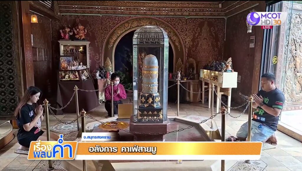 นางพจนา แจ้งจิตร์ ผู้จัดการฝ่ายขาย โรงแรมชูชัยบุรีศรีอัมพวา กล่าวว่า ร้านกาแฟนี้อยู่ริมคลองอัมพวา ใกล้ลานเทวสถาน ที่มีสิ่งศักดิ์สิทธิ์ของศาสนาฮินดูอยู่จำนวนมาก ที่ผ่านมามีคนถูกหวย มาขอโชคลาภ และสมปราถนา จึงได้ชื่อว่า ร้านกาแฟสายมู . – สำนักข่าวไทย